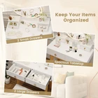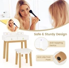 Makeup Vanity Desk with Mirror & Lights, Dressing Table and Chair Set with 3-Color Lighting, 4 Drawers, Solid Wood Legs, Modern Vanity Set for Bedroom, Studio, White + Gold Product Description item 3-color Lighted Mirror for Makeup: The vanity table has a LED lighted mirror for clear reflection. Thanks to the smart touch control, it is convenient to adjust colors (warm yellow/warm white/cool white) or brightness according to your different needs. Ample & Abundant Storage Space: The makeup table has a spacious tabletop to keep your items organized and within reach. Plus, there are 2 small drawers and 2 large drawers to store your jewelry, cosmetics, hair straighteners, and other items. 2-in-1 Design with Detachable Top: The top of this dressing table is removable for different uses. It can be used as a vanity table for you to makeup and dress, or a computer desk to work, study, and more. Cushioned Stool for More Comfort: To bring you ultimate comfort, the makeup vanity set comes with a soft cushioned stool, making your make-up time enjoyable and relaxing. You will feel comfortable even after sitting for a long period of time. Reliable and Stable Construction: With strong solid wood legs and adjustable foot pads, the table and chair stay steady and are not easy to wobble. More importantly, the anti-toppling device helps to secure the dressing table to the wall for enhanced safety and sturdiness. Description: Our vanity set is an essential addition to your bedroom!!! The vanity table set has a LED lighted mirror with 3 colors, allowing you to enjoy your beauty at any time of the day. Meanwhile, you can long press the touch switch to change the brightness. When not in use, you can detach the mirror and use it as a writing desk. Moreover, there is a matched stool for additional comfort. The dressing table is equipped with 2 large drawers, 2 small drawers, 1 wide tabletop to accommodate a lot of things. Additionally, the table and chair feature solid legs and adjustable foot pads for excellent sturdiness and steadiness. Plus, there is an anti-toppling kit to avoid tipping over. Features: Designed with a detachable top for dual use: vanity table or computer desk Easy to make up with clear mirror with lights of 3 colors and adjustable brightness Long press to adjust brightness through the touch control 4 storage drawers for ample storage space Anti-toppling device for higher safety and stability Comfy padded seat cushion for coziness Handy drawer handles to open the drawer Non-slip foot pads for added stability and floor protection Reinforced structure for great strength Safe & sturdy design for long-term use Specifications: Color: White + Gold Material: Pine Wood, MDF, Glass, Sponge Product Dimensions of Table: 31.5" x 16" x 53.5"(L x W x H) Stool Dimensions: 16" x 12" x 17"(L x W x H) Mirror Diameter: 20" Interior Size of Large Drawer: 13" x 11.5" x 3"(L x W x H) Interior Size of Small Drawer: 6.5" x 3.5" x 2.5"(L x W x H) Weight Capacity of Tabletop: 110 lbs Weight Capacity of Stool: 330 lbs Net Weight: 53.5 lbs Package Includes: 1 x Vanity Table 1 x Stool 1 x 12V1A Power Adapter 1 x User Guide