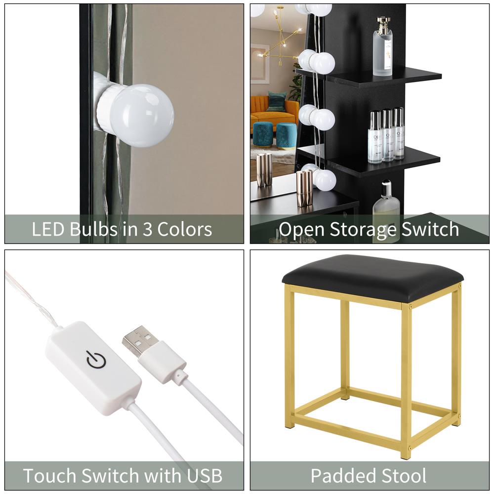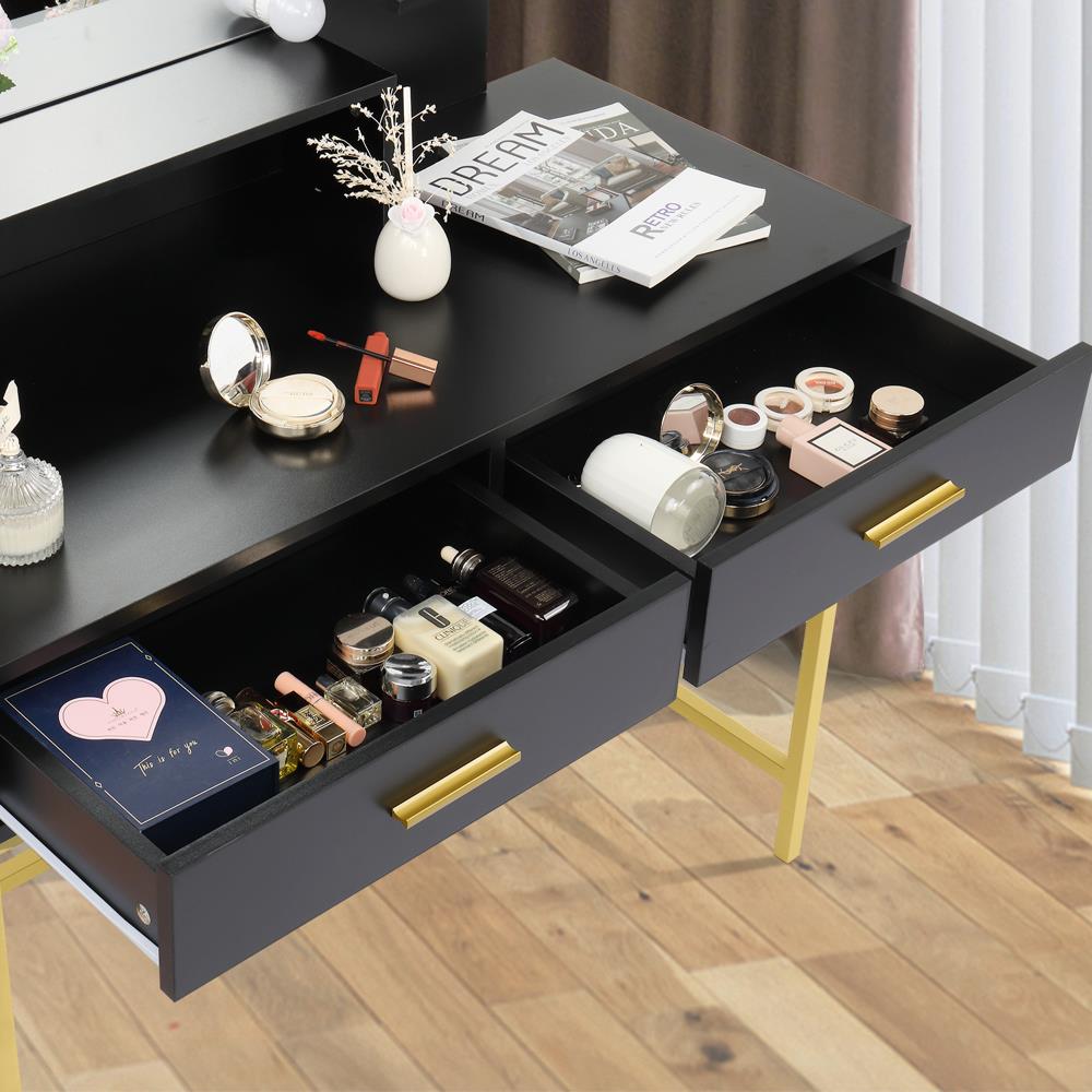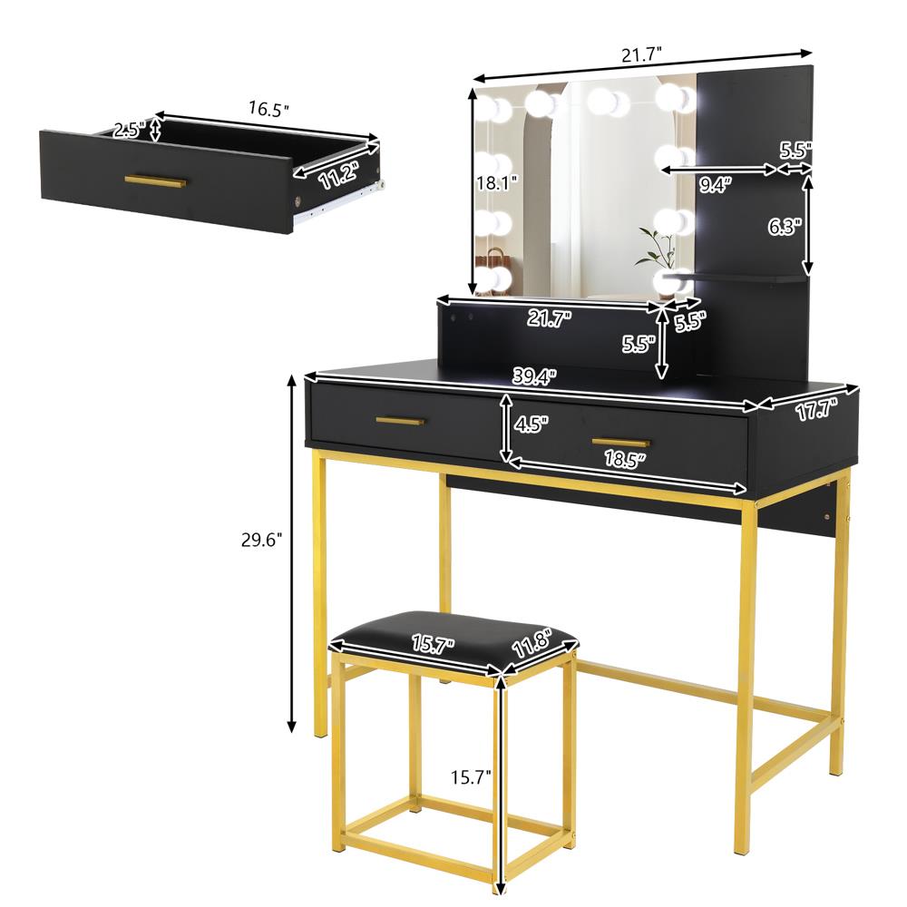 listing template VISIT OUR STORE SIGH UP FOR EMAIL Makeup Vanity Desk Set with Mirror & Lights 2 Drawers Dressing Table for Bedroom Introductions: Start a beautiful day in front of this lighted mirror vanity set. Come with 10 LED light bulbs which can be stick to the mirror with different shape as you like. With 2 drawers and side storage shelves, all your beauty secret are at hand. Simple & modern design with gold & white color makes it a brightness to your bedroom. Features: 1. Gorgeous Hollywood style illuminated mirror: 10 LED bulbs on the mirror will illuminate evenly from all directions, helping you create the best look with your makeup. The color of the light is adjustable so you can get just the right lighting for you and your room. 2. Ample storage capacity: Built with 3 shelves and 2 large drawers, staying organized has never been so easy. Open Shelves on table top are also a good place to showcase your picture frames, jewelry, flowers and more. 3. Higher level of craftsmanship and quality: Crafted from strong golden metal frame and top grade particle board, this makeup vanity with lights will serve you for years to come. 4. Stylish and functional: This vanity table has a versatile look that complements a wide variety of room decor. A large table top is ideal for keeping all your makeup, perfumes and trinkets within an arm's reach. Specifications: Material: Particle Board & Metal Color: White & Gold Overall Size: 39.4"L x 17.7"W x 53.3"H Table Size: 39.4"L x 17.7"W x 29.6"H Stool Size: 15.7"L x 11.8"W x 15.7"H Mirror Size: 21.7"L x 18.1"H Overall Weight: 61.7lb Package Includes: 1 x Dressing Table 1 x Stool 1 x Instructions 1 x Accessories Pack Shipping Policy 1. Ship worldwide from New Jersey by reliable shipping companies -- USPS, UPS, FEDEX, DHL, etc., and only to VERIFIED PAYPAL ADDRESS. Transport Delivery ETA. Package handling only takes 1 business day at our warehouse, so please make sure entering correct payment and shipping information before checking out. Once your payment is completed, we are not going to accept any more changes to your order. 2. International Buyers – Please Note: a. Import duties, taxes and charges are not included in the item price or shipping charges. These charges are the buyer's responsibility. b. Please check with your country's customs office to determine what these additional costs will be prior to bidding/buying. 3. Please check your shipping address carefully before checkout, it can't be changed if order completed. 4. Orders placed on weekend will be shipped within 2 days.Notification of shipment with tracking number will be sent to buyers. 5. Standard shipping: 2-7 business days Expedited Shipping: 2-3 business days One-day Shipping: 1 business day International shipping: Varies 6.Ship within 1 business day once payment completed. Notification of shipment with tracking No. will be sent to buyer. 7.We offer discounts for combine shipping. Please contact us first if you need combine shipping, and an invoice with discount will be sent to you. 8.Please allow 5 business days for delivery to US destinations on any eBay orders and 14 business days for delivery to any International destinations. We highly recommend our buyer choose priority/expess mail for international delivery which is much more stable. Return Policies 1. Refunds given only if item DOA and cannot be replaced via PAYPAL . If so, Please contact us with 5 days since you receive the item and and return to us within 30 days from the delivery date for exchange or refund. 2. If you need return, please contact our customer service representative, let us know the detailed problem and send us some pictures for confirmation. Payment Payment should be sent within 8(EIGHT) days of auction closing. Feedback If you are dissatisfied for any reason, please do not be quick to leave negative/neutral feedback. We work hard to make sure EVERY CUSTOMER 100% SATISFIED and resolve any problem for you. Work Time Work Time: Monday to Saturday About Us | Newsletter| Feedback| Contact Us Copyright © 2022 LikeDeal. All rights reserved. 无标题文档 Makeup Vanity Desk Set with Mirror & Lights 2 Drawers Dressing Table for Bedroom Introductions: Start a beautiful day in front of this lighted mirror vanity set. Come with 10 LED light bulbs which can be stick to the mirror with different shape as you like. With 2 drawers and side storage shelves, all your beauty secret are at hand. Simple & modern design with gold & white color makes it a brightness to your bedroom. Features: 1. Gorgeous Hollywood style illuminated mirror: 10 LED bulbs on the mirror will illuminate evenly from all directions, helping you create the best look with your makeup. The color of the light is adjustable so you can get just the right lighting for you and your room. 2. Ample storage capacity: Built with 3 shelves and 2 large drawers, staying organized has never been so easy. Open Shelves on table top are also a good place to showcase your picture frames, jewelry, flowers and more. 3. Higher level of craftsmanship and quality: Crafted from strong golden metal frame and top grade particle board, this makeup vanity with lights will serve you for years to come. 4. Stylish and functional: This vanity table has a versatile look that complements a wide variety of room decor. A large table top is ideal for keeping all your makeup, perfumes and trinkets within an arm's reach. Specifications: Material: Particle Board & Metal Color: White & Gold Overall Size: 39.4"L x 17.7"W x 53.3"H Table Size: 39.4"L x 17.7"W x 29.6"H Stool Size: 15.7"L x 11.8"W x 15.7"H Mirror Size: 21.7"L x 18.1"H Overall Weight: 61.7lb Package Includes: 1 x Dressing Table 1 x Stool 1 x Instructions 1 x Accessories Pack Shipping + 1. Ship worldwide from New Jersey by reliable shipping companies -- USPS, UPS, FEDEX, DHL, etc., and only to VERIFIED PAYPAL ADDRESS. Transport Delivery ETA. Package handling only takes 1 business day at our warehouse, so please make sure enterin