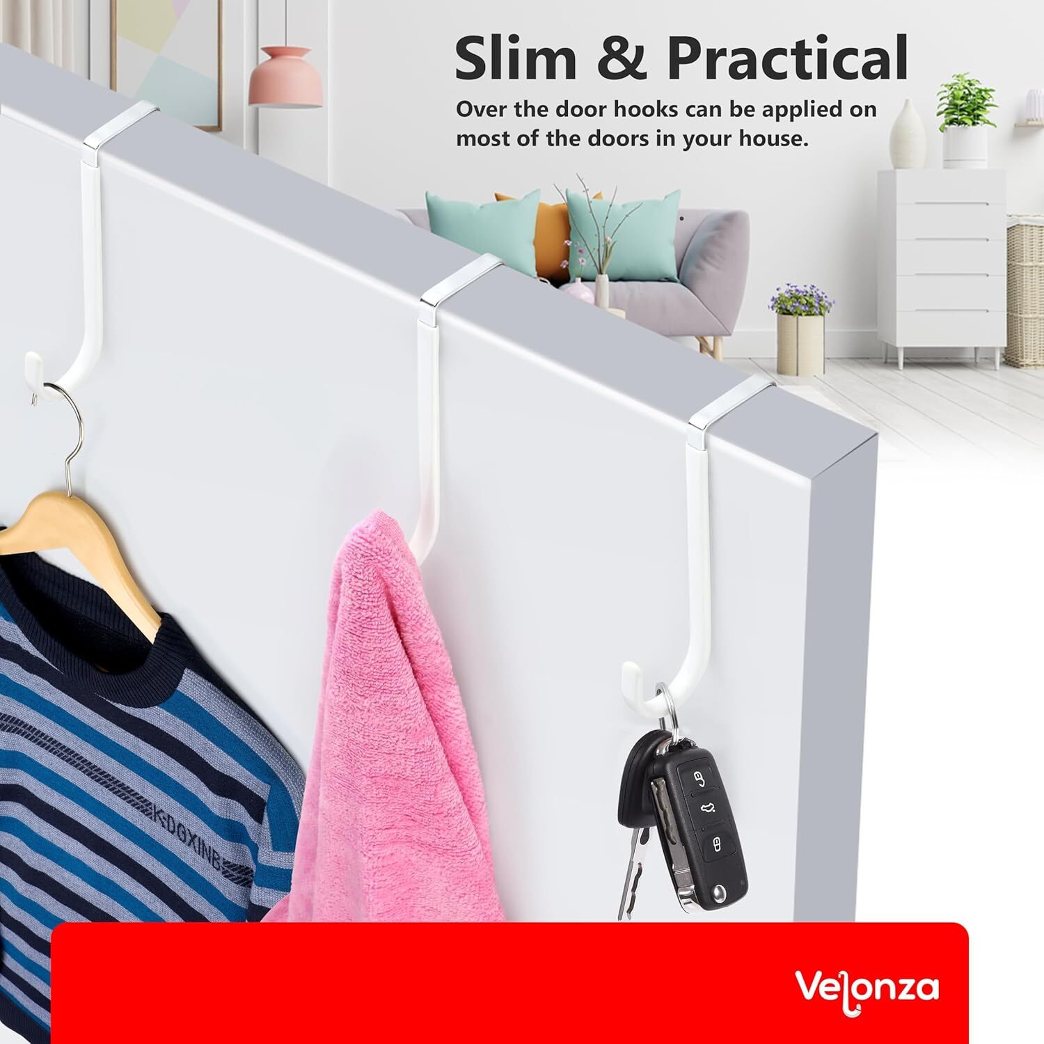 6 Pack Over The Door Hooks Wreath Hanger - White Rubber Coated Door Hanger Hooks - Scratch-Resistant - Ideal for Living Room, Bedroom, Kitchen - Perfect for Towels, Hats, Coats, Bags and clothes About this item Heavy Duty Door Hanger: Made of high-quality durable metal with a strong load-bearing capacity, these over the door hanger can hold up to 20 pounds, ensuring they can securely hold your items without bending or breaking Rubber Coated Hooks: Door hooks are coated with soft rubber, which are not only to protects your doors from scratches but also provides a comfortable grip for hanging items. Over the door hooks for hanging can be used in bedrooms, bathrooms, living rooms, and kitchens Versatile Usage: Over the door hook can be used to hang a variety of items, such as clothes, towels, hats, coats, bags, and more. They are perfect for organizing your space and keeping your items neat and tidy Easy to Install: With a simple installation process, Over door hooks can be attached with any door in seconds without using any tools, convenient and hassle-free solution for organizing your home. Space Saving: Over door hanger take up minimal space, making them ideal for use in small spaces such as apartments, dorm rooms, and RVs. They can help you maximize your storage space and keep your home clutter-free. Multi-Purpose: Whether you need extra hanging space in your bedroom, bathroom, or kitchen, these hooks are the perfect solution. Ideal for Christmas Wreath Hanger.