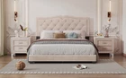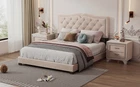 Product Information Main Color: Beige Main Material: Velvet Product Dimensions Item Length (in.): 84.30 Item Width (in.): 64.20 Item Height (in.): 47.60 Weight (lbs.): 63.00 Package Size Length (in.): 65.75 Width (in.): 25.39 Height (in.): 4.92 Weight (lbs.): 73.19 Product Features [Elegant Design] The headboard of this bed is made of plush velvet, which gives it a soft and luxurious feel. The entire bed exudes an air of elegant sophistication. Headboard is included as a comfy velvet fabric backrest that brings you and your partner a cozy feeling. [Adorned with rivet accents] This Upholstered Platform bed features a plush velvet headboard with a charming tufted design, highlighted by a circle of decorative rivets placed elegantly along the outer edge of the tufting. These rivets add a touch of elegance and sophistication to the bed. This bed seamlessly blends comfort and modern flair. [Solid & Sturdy] The bed frame is made of solid MDF and Plywood, providing a dense and strong support for up to 700lbs. The construction ensures both a lifetime of use, and a sturdy bed frame with a head which won't wobble. [No Box Spring is required] This queen bed frame comes with 10 plywood slats, and as such this bed does not require a box spring. [Dimensions] Overall Dimension: 84.3 x 64.2 x 47.6 inches (L x W x H) . Suitable for mattress Queen size(Mattress is not included)