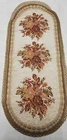 This stunning Belgium brocade design has a lot of detail and care put into the pieces. The doilies/runners are all padded for additional presence and provide protection on furniture pieces. The edges are finished with a metal trim. There is lurex thread running through the design for added interest and beauty. Dry clean only 95% viscose/5% metal