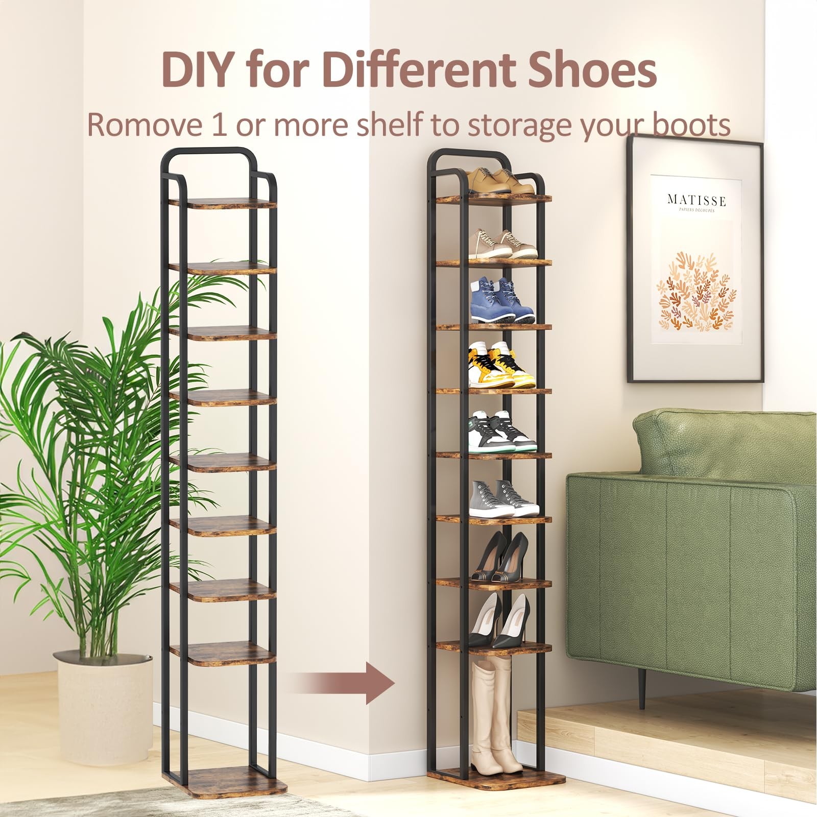 freestanding shoe rack 【Space Saving Narrow and Tall Shoe Rack】: This vertical shoe rack is very suitable for use in small spaces. It makes full use of vertical space and occupies a very small space, which is very suitable for entryway, living room, bedroom, corridor and garage, etc. 【As Flexible as You Want】: The shelves are adjustable, if you get two or more shoe racks, you can set up the shoe rack either way you like. In addition, you can remove 1 or 2 shelves to fit shoes of varying heights. 【Stable Home for Your Shoes】: The shoe storage organizer is made of high-quality particleboard. Each partition can easily bear the weight of 11 lb, and the large partition at the bottom helps the shoe rack stand firmly on the ground, giving your shoes stable, reliable support 【Worry-Free Assembly】: There’s no need to be afraid of the assembly of this shoe rack, as easy-to-read, illustrated instructions and labeled parts are provided for hassle-free assembly. Easier assembly, easier life! 【What's in the package】: The tall and narrow shoe rack organizer from , with user manual. We care much about your shopping experience! Whatever product details, installation difficulty, missing parts or quality issues, just come to us with support.