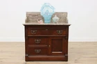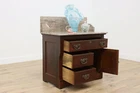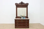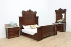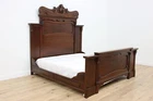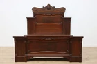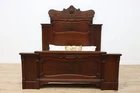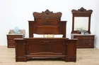 Item # 53246 This fantastically carved Victorian period three piece bedroom set includes a king size bed plus a dresser with mirror and a commode or washstand with marble tops. American antique 1880s furniture Beautiful carved solid walnut & figured walnut Old crazed varnish has been cleaned and preserved with a coat of clear finish Minor mars for antique character Original ornate brass hardware has tarnishing - see photos Drawers have pin & cove joints, no keys Beveled mirror has a bit of "smoke" for antique character Removable "Tennessee Red" marble tops have been polished & sealed for protection Bed is expertly adapted to fit a modern king size demonstrator mattress as shown and includes wooden cross supports as shown Bed setup is not included Headboard & dresser crests are removable Overall bed size is 88.5" long and 87" wide. Headboard is 85" tall and the footboard is 35" tall. Slats sit 6.5" from ground and the demonstrator mattress is 16" thick. Interior dimensions of the bed frame are 80” long and 78” wide. Without crest, headboard is 69.5" tall, so measurements should be considered for delivery. Dresser with removable mirror size is 48.5" wide, 23.5" deep and 90.5" tall. Without crest, height is 77" tall. Washstand size is 36.5" wide, 20.5" deep and 39" tall. Please view 46 photos at full screen size for best detail. Related items in photos are sold separately. Important Shipping information: We offer significant discounts for shipping multiple pieces out of state. Posted ship rate based on GROUND FLOOR delivery from a trusted blanket wrap service provider. Most deliveries occur within 30 business days of payment, some slightly longer, some shorter. IMPORTANT: AZ, CA, CO, ID, MI, MT, NE, ND, NM, NV, OR, SD, UT, WA, WY and New York City are serviced by a courier van with ONE DRIVER , adequate physical help from the homeowner to unload is required. *Deliveries that require stairs or elevators take more time and can usually be completed with advance notice and a surcharge. *Items requiring a ferry or remote area (Mountain homes, Islands, Keys, etc.) may be excluded from posted rates. *Delivery to properties with COI requirements or limited hours for service may be excluded from posted rates or additional charges may apply. Contact us for more information. Discount rates available to many areas in WI, IL, MN as well as FREE Store Pick Up in Kaukauna, WI. Contact us for more information. Store Information Payment methods The Harp Gallery 2101 Progress Way Kaukauna, WI 54130 Shipping & Handling Buyer pays shipping. Contact us to request independent shipping quotes on Freight Items. Also visit our eBay store for shipping info . Sales tax 5.5% sales tax applicable for WI buyers and customer pickup in Kaukauna, WI. Customer Service & Return Policy We are only happy with satisfied customers! Please reach out to us with any concerns or questions. Return policy: 15% restocking fee/buyer pays return shipping.