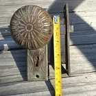 This is a beautiful very old piece. Beautiful patina on the brass. Please see pictures for description. Same day business shipping. This Victorian ornate brass door knob set includes plates and a lock, all with a geometric pattern. The bronze hued brass material adds a touch of elegance to any door, making it a unique and stylish addition to any home or office space. The set does not come with a key, making it a functional and decorative piece that adds a bit of mystery to its charm.