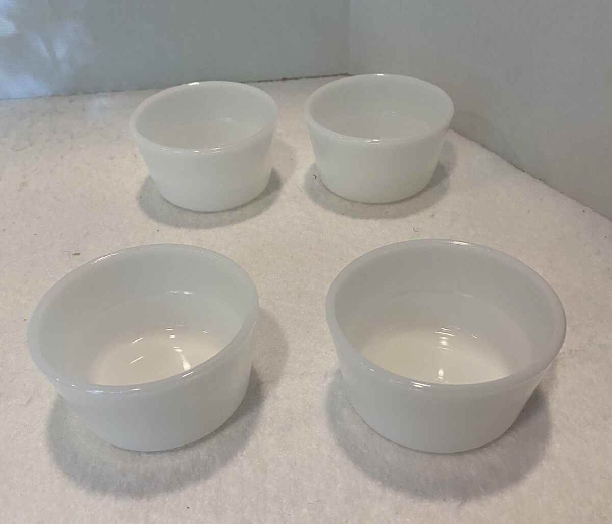 Set Of 4 Vintage 1950s Glasbake Milk Glass Custard Cups Bowls Ramekins EUC There are a couple small marks on the bowls, but no chips or cracks. Bowls are in excellent preowned, vintage condition. Please see pictures for full description. Set #1