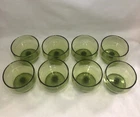 These are eight lovely little mid century dessert cups made by Anchor Hocking. The Finlandia line is a stunning avocado green glass set, smooth and free from imperfections. Each one is 3” tall with a 3.5” diameter cup sitting upon a footed base. They do stack inside one another if needed.