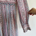 Vintage 1970 Cottagecore Victorian Maxi Dress Prairie Floral Smocked High Neck. Sheer sleeves with smocked detail on the cuffs. Dress is fully lined, except for the sleeves. Metal zipper on the back. Size: NO SIZE TAG. PLEASE SEE MEASUREMENTS TO ENSURE PROPER FIT Approx. measurements: 17" across (pit to pit), 14 waist, 52" long (shoulder to hem) Condition: Pre-owned good. Pre-loved and in gently used condition. Light wear. A few faint stains on the front, just under the chest. Please see all pics for any wear/condition. cottage, cottagecore, prairie, prairiecore, little house on the prairie, florence welch dress, Victoriana, regency, victorian, romantic