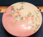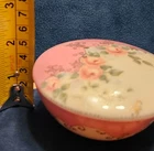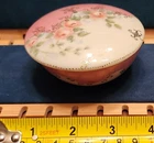 Vintage 1974 Limoges France hand painted and signed pink floral round powder jar dish or Trinket box. Bathroom decor Vanity powder make up