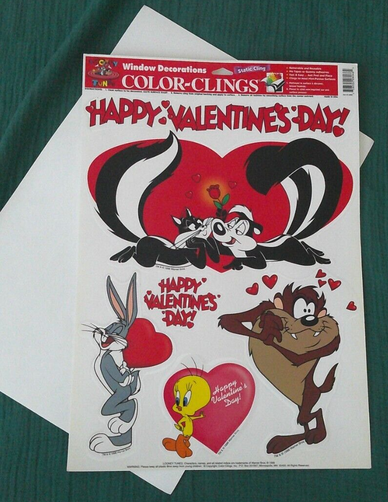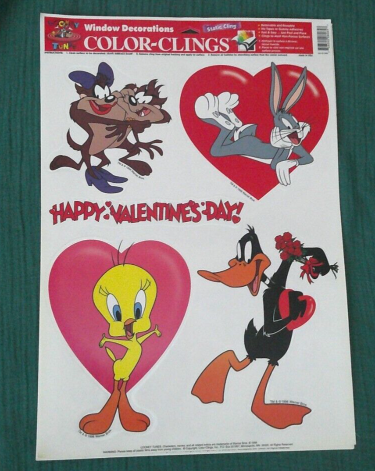 Vintage 1996 Static Cling Window Decorations LOONEY TUNES Valentine's Lot Of 2 Bugs Bunny, Taz, Daffy Duck, Tweety Bird EUC