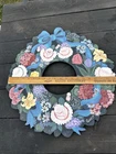 Enhance your home's charm with this vintage 20-inch painted wreath, a delightful blend of floral and rustic elegance. The wreath features an array of vibrant blooms including dahlias, hydrangeas, daffodils, and daisies, meticulously crafted on a durable wooden base. Its multicolored palette adds a festive touch to any space, making it an ideal choice for year-round decoration. Crafted with the West Pattern in 1992, this door decoration brings a shabby farmhouse feel to your living area. Perfect for any occasion, it serves as a versatile and timeless piece that will warmly greet your guests and add a splash of nature's beauty to your doorstep. Rosemary West pattern from 1991. The wreath measures 20” Painted and signed in 1992. Has a few tiny scratches. Please see detailed photos