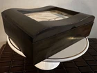 This fantastic Wooden Jewelry/ valet box is sure to match your style because you determine your style. Insert a photo, drawing, Mirror, or any inspirational statement or small poster. Made of beautiful mahogany. Divided into two compartments. Perfect for your jewelry, your wallet, keys, cufflinks - or use for a couple decks of cards or chips. There is plenty of room in this box. Lined with dark velvet. 8”L x 6”W x 2.5”T Great pre owned condition.