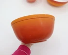Vintage Pyrex Dishes in the pattern Flameglo, which is a red to orange ombre. These mixing bowls were made in the 1970s for a short period of time. It is missing one nesting bowl, so it is not a complete set. These dishes are great for use or to add to your Pyrex collection. The bowls range from good to fair condition. Shows signs of wear from age and use, such as discoloration, scratches and other markings. The largest bowl in the set has the most scratches. See photos for details. From largest to smallest, the diameter of the bowls measure as followed: 10.5", 8.75", 5.75". Message me with any questions!