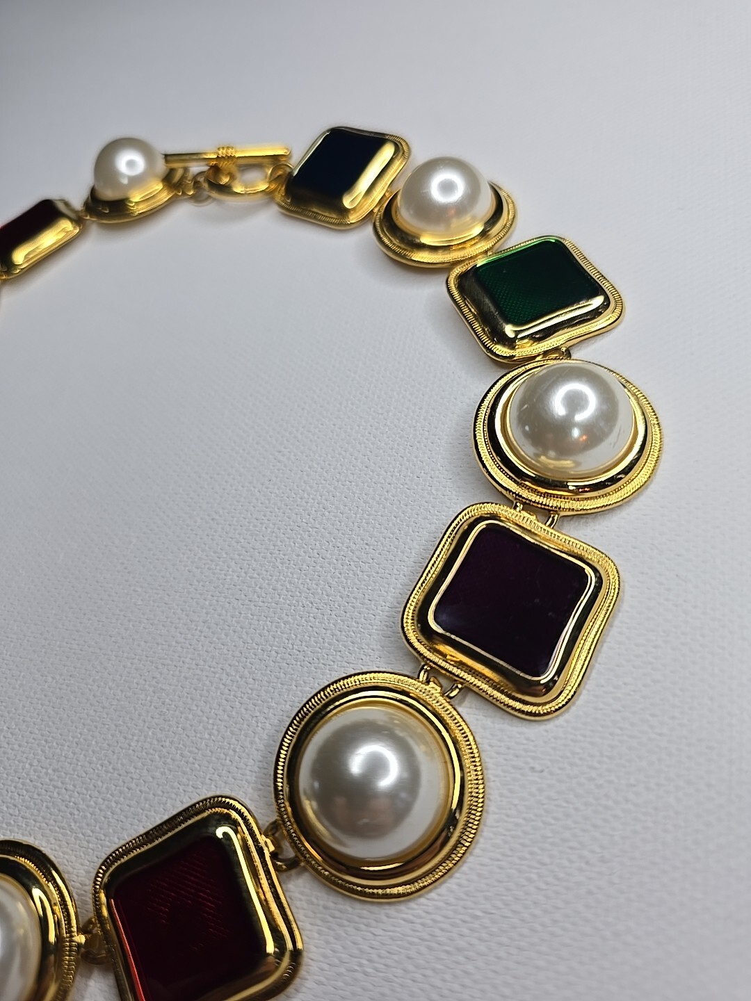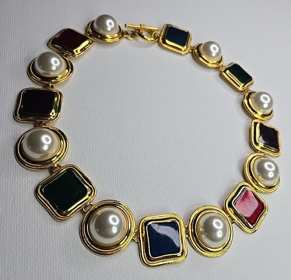 The product is a vintage 80's multicolor choker necklace. It features a vibrant mix of gold,pearl,red green,amethyst,green and has a choker style, making it a trendy and statement piece of fashion jewelry. Perfect for adding a pop of color to any outfit with its unique and retro-inspired design.