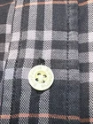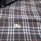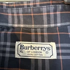 Elevate your wardrobe with this classic Burberry Nova Check button-up shirt. Made of 100% cotton, this navy plaid shirt features short sleeves and a collared neckline, making it perfect for travel, casual outings, or business meetings. The shirt is vintage from the 90s and has a regular fit, with button accents and a woven fabric type. The Burberry shirt is perfect for men who want to add a touch of vintage style to their wardrobe. The Nova Check pattern and 90s theme make it a unique and stylish choice for any occasion. This shirt is available in size L and is a great addition to any collection. In excellent used condition. A couple of pulled threads on bottom see pics