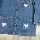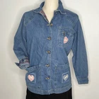 Vintage 90s Denim Jean Button Front Jacket with Plaid Trim and Heart Patches, Cabin Creek Brand, Size Small Petite Oversized Fit, Good Condition Measurements (approximate): Laying Flat not Doubled Pit to Pit: 20 3/4” Length: 27 1/4” Sleeve Length 21 3/4"