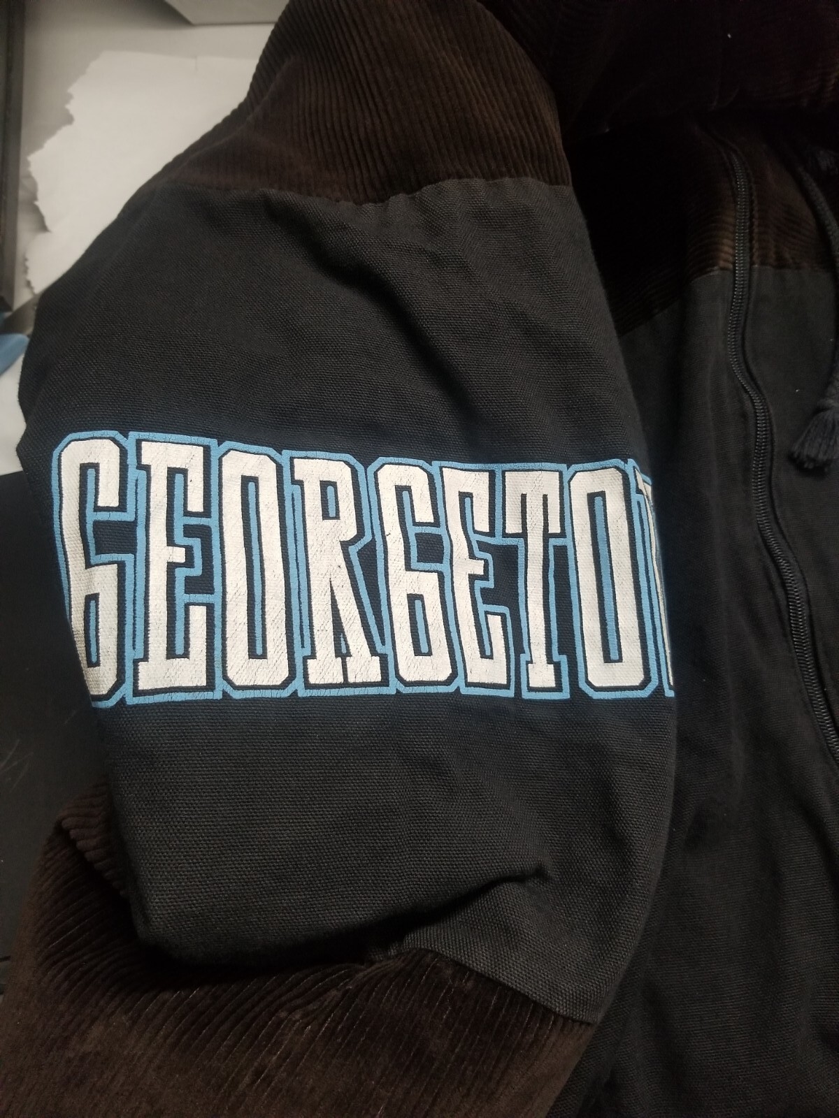 Preowned vintage Georgetown hoya jacket. Really cool George town jacket. Elastic band and Corduroy texture. Collar to waist 23.5" Pit to pit 21.5" Some fading / stain back near logo / small hole front. See last photos.