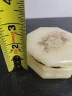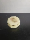 Embrace the charm of Italian craftsmanship with our Vintage Alabaster Trinket Box, complete with a elegant gold trim. The ivory hue of the alabaster coupled with the intricate floral pattern makes this piece a timeless keepsake for any occasion. Its origin from Italy assures the authenticity of its mid-20th-century design, ensuring it's not just a holder but a piece of history. Carefully handmade, this trinket box arrives boxed, making it ready to be a centerpiece in any room. To maintain its luster, a simple wipe with a damp cloth is all it needs. This piece is an original, engraved-free, and customized treasure that promises to add a touch of sophistication to your collection. See all photos for wear and condition.