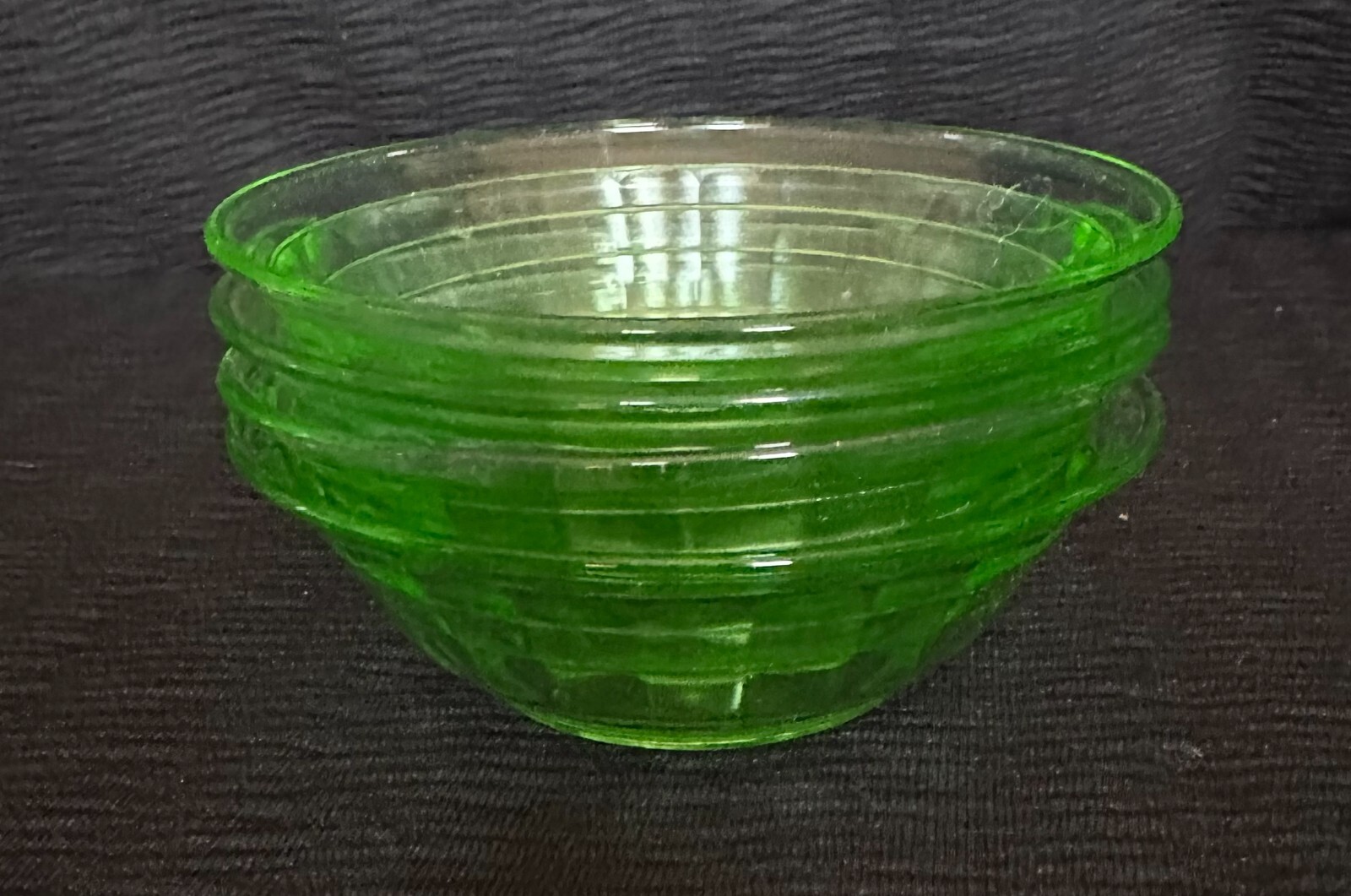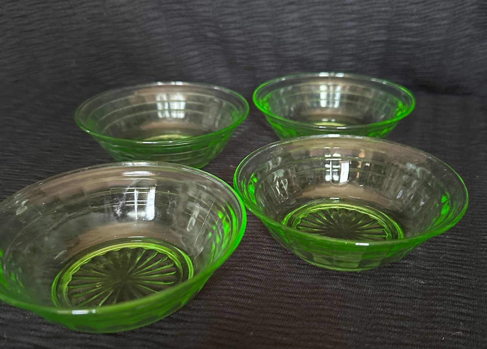 The Anchor Hocking 4.25" Green Block Optic Uranium Fruit/Dessert Bowls are a vintage set of 4 round glass bowls with a glossy finish in a vibrant green color. This original Block Optic product line from the Great Depression era exudes a stylish and elegant look perfect for serving desserts. Made by the renowned brand Anchor Hocking, these bowls are a charming addition to any table setting and are sure to add a touch of nostalgia to your dining experience. Depression glassware often bears flaws resulting from the manufacturing process, such as bubbles or obvious seams . In a finer piece of glassware, these imperfections would have been corrected during the manufacturing process. Bubbles: tiny bubbles, or other imperfections and irregularities, are more common in antique glass - you may need a magnifying glass to see some of these. PLEASE READ THE INFORMATION BELOW USA Shipping Only CONDITIONS & DESCRIPTIONS: Items are sold in "As-Is" "As-Found" Condition, especially Vintage and Antique items. Some antique items may have occasional wear spots, dents, and scratches that cannot or should not be removed as that would lessen the value. We will describe them to the best of our ability and point out any flaws or damages. Please refer closely to our photographs (which are part of the listing), as they will sometimes speak for themselves and are a pertinent asset to the listing text. We are not experts, nor are we (or ever have been) an Antique Dealer. ASK ALL QUESTIONS BEFORE PLACING A BID OR MAKING A PURCHASE, as by placing a bid or making your purchase, you agree to the terms and conditions presented. SHIPPING & RETURNS POLICY : We use USPS Mail shipping on an item, which includes insurance on the item you have purchased. We are doing this for “our” protection, and it guarantees you tracking and insurance on the item (mostly those under $50.00). If the item is damaged or broken in shipping, please contact your local post office for a refund on the item. Since we insure all our shipments by the best shipping offered with insurance, we do not issue refunds on items damaged in shipping. If you choose a different shipping method, refunds and returns WILL NOT be accepted. (We reserve the right to change courier to provide the best shipping options for our buyers to receive their items timely and safely. Any shipment damaged, please send us a copy of the photos of the shipping label, each side of the package and the damaged item, which are the same photos required by the USPS office or any carrier for the insured item. Once items are handed over to the courier, we assume no liability for items damaged during shipment if you wish to have your purchase shipped without insurance, but they will Always be packed with the utmost care so as to reach you in the condition you are seeing them in and are shipping with a minimum of $50 insurance using USPS Mail. CONCERNS: Please contact us with any issue you have with the item received. If item is excepted as a return, buyers are responsible for the returned shipping (USPS GROUND ADVANTAGE ONLY), as most of our items are shipped at no additional charge to you, our customer. Should any problems arise, IMMEDIATE contact would be appreciated, as issues can and will be dealt as these items are often in "Used", "As-Is/As-Found" Condition. With that said, THERE ARE NO RETURNS ON THESE ITEMS UNLESS SPECIFIED OTHERWISE in the above policy. Be sure to ask all questions before placing a bid or making your purchase, as by doing so, you have agreed that the terms of our auction/buy it now inventory.