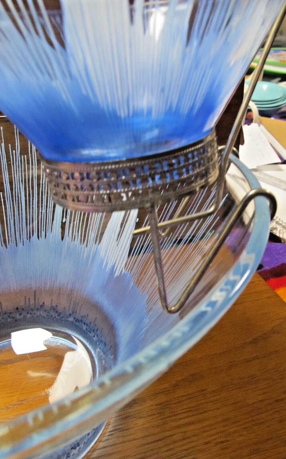 1950's Anchor Hocking? Blue and White Splash/Splatter design. Chip N' Dip Bowl Set, mid-century, silver toned metal attachment, This spectacular chip and dip bowl set has a very distinct look with a vivid design featuring blue splash like drips into a white background. The dip dish is beautifully suspended with a bracket attachment which is silver toned and accented with a filigree trim. The Set is unmarked but is believed to be Anchor Hocking. It is a rare vintage find, particularly in blue. In excellent condition and would be a great for any party or special occasion. No Damages, Dimensions: Chip Bowl-Diameter (rim) 10.5", Height 5 7/8" Dip Bowl: Diameter (rim) 5 1/4", Height: 2.5"