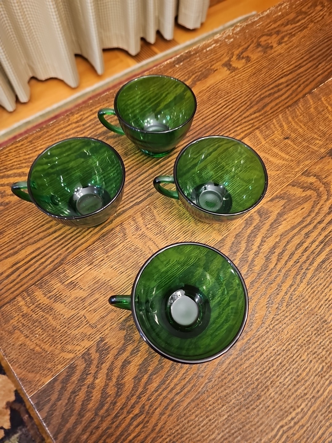 Nice set of 4 Anchor Hocking Green punch/tea/coffee cups. 2 1/4" tall x 3 1/4" cup opening diameter. No chips or cracks.