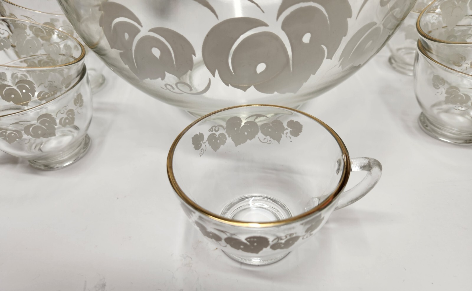 Anchor Hocking Gooseberries Pattern 6 qt. Vintage Eggnog / Punch Bowl & 9 Cups - Gold Rim White Leaves Dimensions Punch bowl has a 10" diameter and 5.5" height Cups have 3.25" diameter and 2.25" height