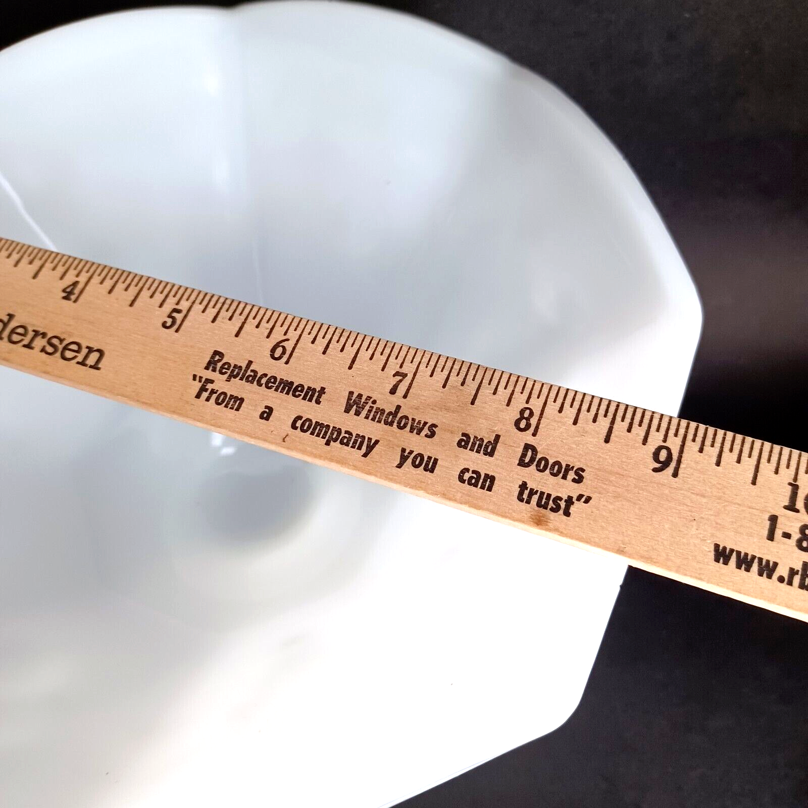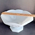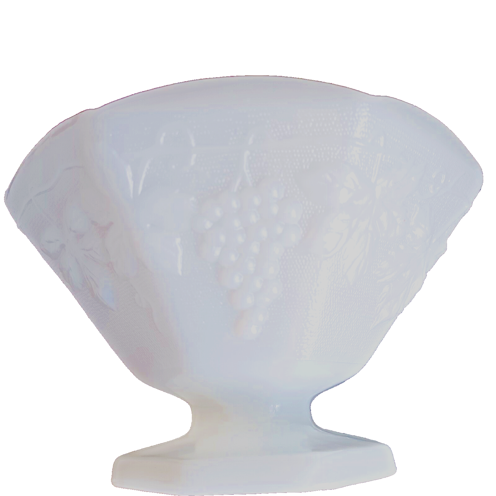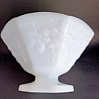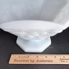 This vintage milk glass bowl from Anchor Hocking features an octagonal shape and a beautiful grapes pattern. The bowl stands on a footed base, making it a perfect fruit compote for all occasions. Measuring 9 and 5 3/8 inches in height, this glossy white glass bowl is a unique decorative piece for any kitchen or dining room. Crafted using pressed glass production technique, this original piece by Anchor Hocking Glass Co. is perfect for vintage collectors. The embossed backstamp and the brand name ensure the authenticity of this unique item. Add this piece to your collection today and enjoy its decorative and functional features.