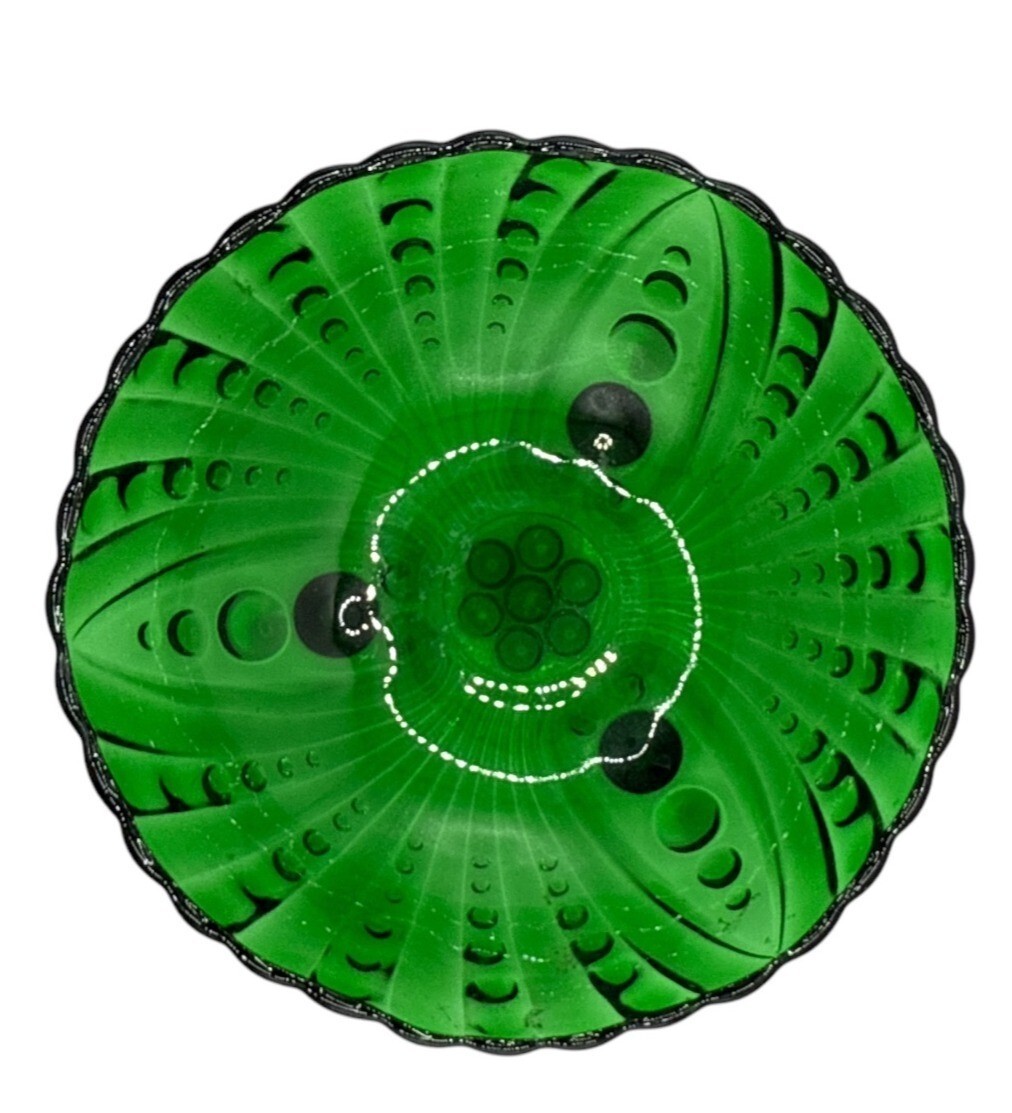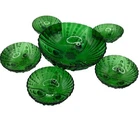 Step into a bygone era with this vibrant green glass bowl and matching 5 small bowls set. With scalloped edges and intricate patterns, it evokes timeless charm, perfect for sophisticated gatherings or nostalgic keepsakes. Its luminous green hue catches light beautifully, setting a mood of elegance and vintage allure. • Includes 1 serving bowl & 5 smaller plates for cohesive dining • Scalloped edges and unique detailing • Durable glass construction with a vintage design • Eye-catching vibrant green color Bowl diameter = 8 inches; No visible flaws or damages detected in condition. Condition: Pre-Owned Good