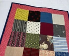 Up for sale is a vintage/antique patchwork quilt table topper or doll quilt. The design is Four Patch. The fabrics are very early calico prints, florals, dots, checks, stripes. Great examples of early calico prints. The colors are blue, burgundy, green, yellow, black, navy blue, off white, green, gold, pink, red, multi. Great colors. The back is navy blue dot calico print. The border is navy blue dot calico print, hand sewn. Medium thickness. Tacked at center. Great early calico prints. Hand made. Made in USA. Measures 12 3/4” by 12 1/4”. Made from an antique quilt top - 1880’s to early 1900’s. Very, very good condition. Hand made. Made in USA. 🌺🌺🌺🌺 Thanks and happy bidding. I will combine shipping charges. Smoke free home. Please make payment in three days ~~~~🌹🌻🌷Please visit my eBay store: 🇺🇸webbsamericancountry1🇺🇸 for over 2000 vintage and collectible items.~~~~❤️