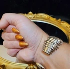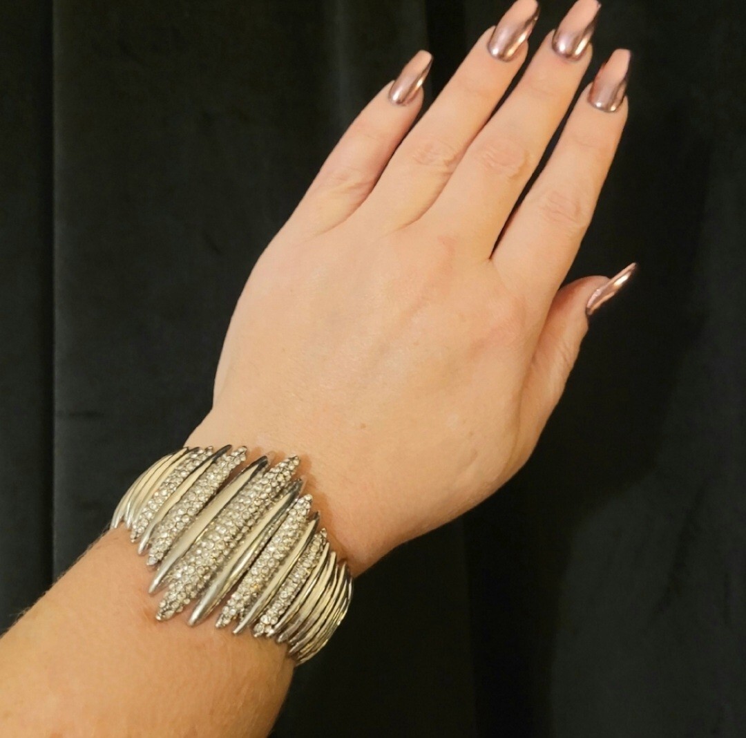 This vintage Art Deco cuff bracelet exudes glamour and sophistication. The fierce white crystal centerpiece adds a touch of elegance to any outfit, making it perfect for special occasions such as birthdays or Christmas. The round, colorless crystal is complemented by the shimmering silver metal, making this bracelet a must-have for any vintage jewelry collector. The cuff style adds a modern twist to this classic piece, making it suitable for any wrist size. This bracelet is perfect for those who appreciate the beauty and craftsmanship of vintage jewelry. 2" Wide Adjustable Silver tone base metal / crystal