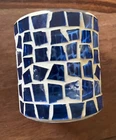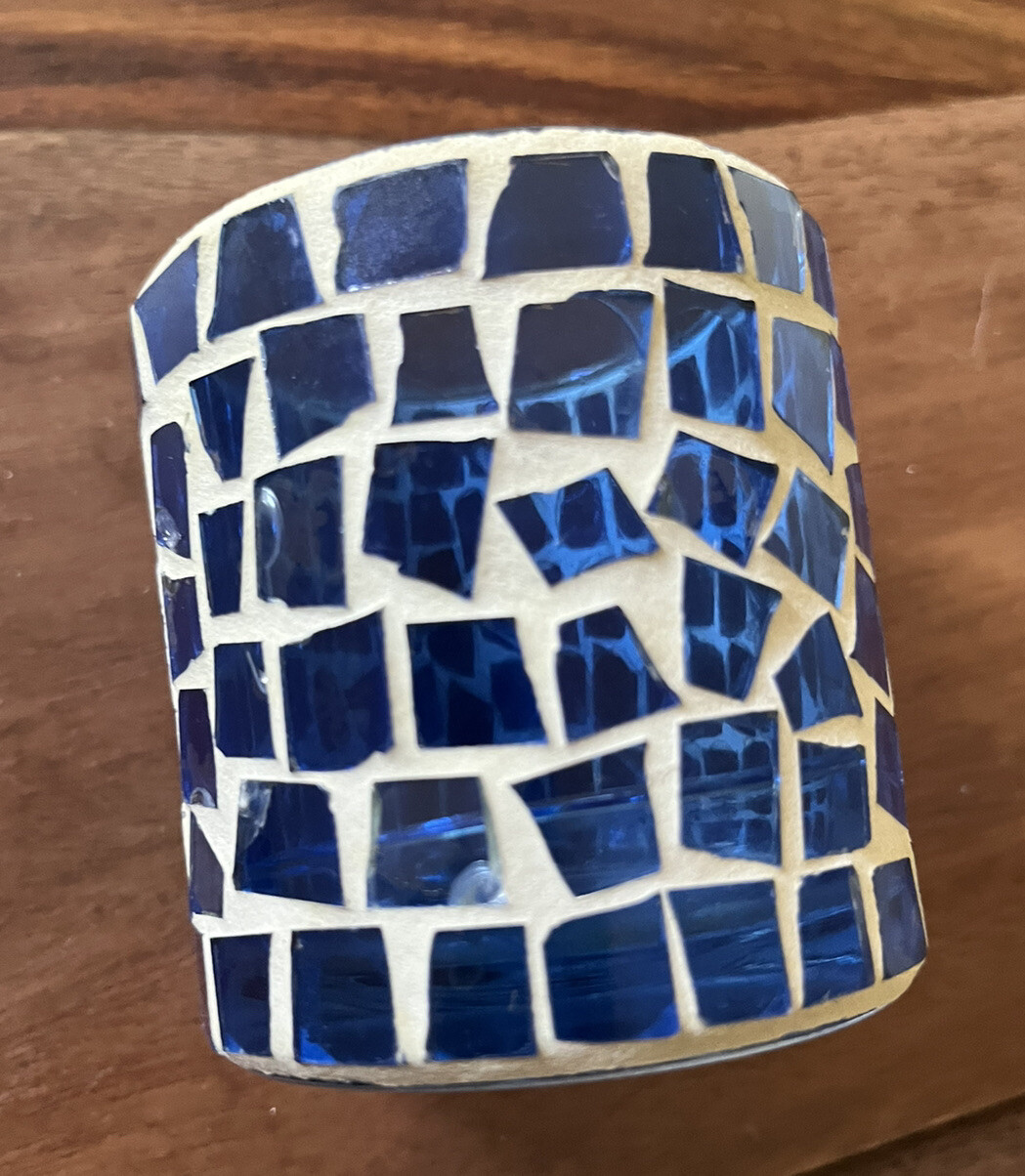 Blue Mosaic Glass Tealight Votive Candle Holder Vintage 3”h 3”d Vintage pre-owned - one tile has chip, some putty missing along rim. Please review images