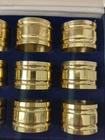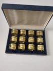 12 piece set solid brass napkin rings. 1 ring has a tarnish damaged spot -see pics