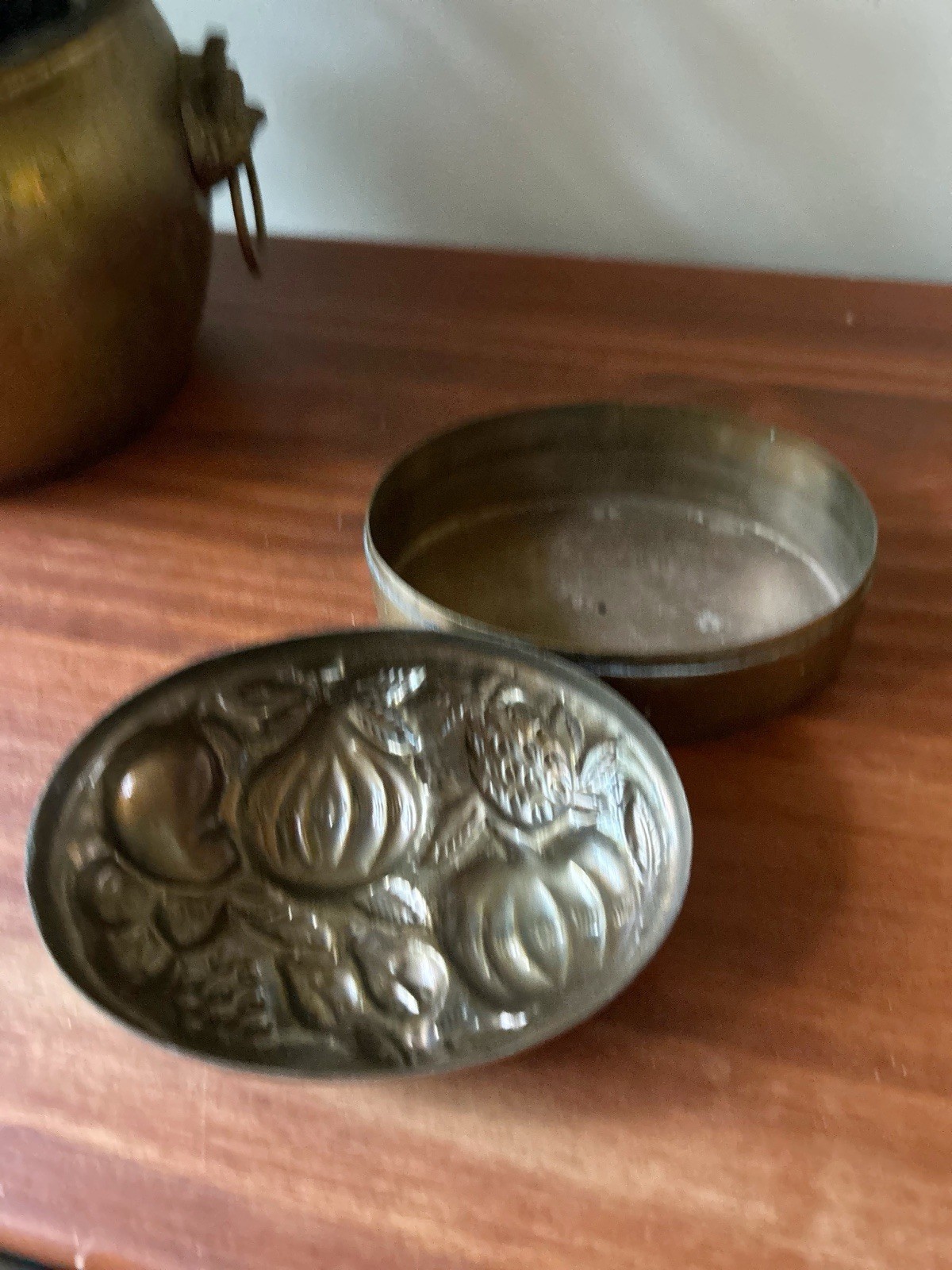 Vintage brass embossed fruit box with lid. Good condition. Measures 5 x 7 inches and 4 inches tall. Combined shipping is available for all of my items listed.