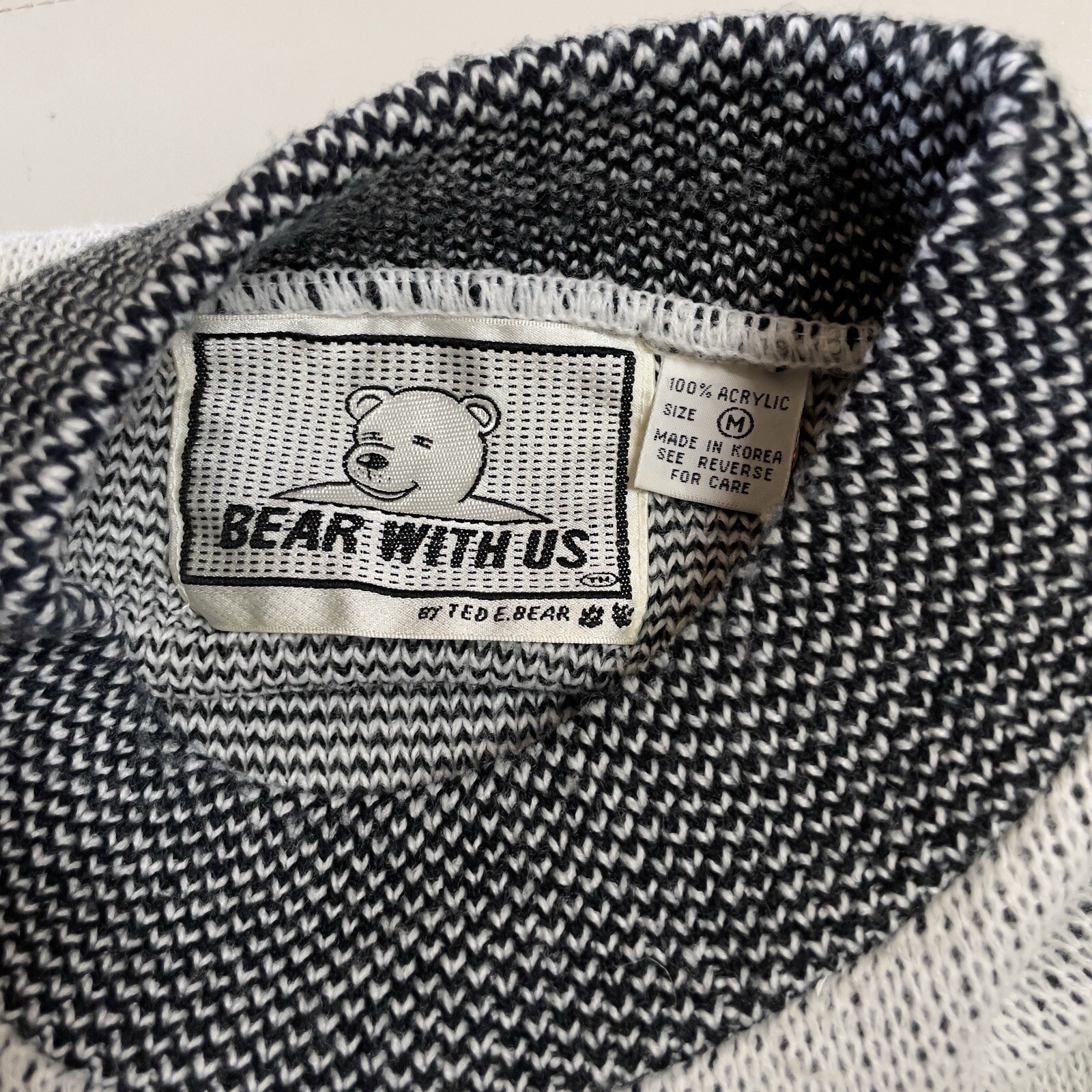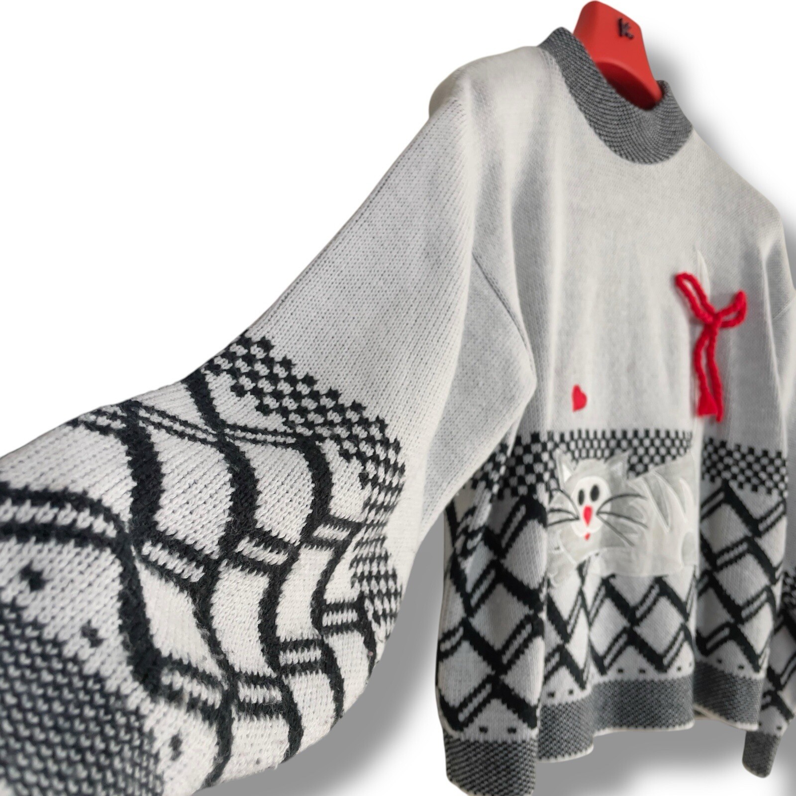 100% acrylic | Korean made SUPER CUTE vintage 80s black white pullover animal checkered geometric print knit sweater long sleeve crew neck sweatshirt by Korean street style made brand ‘Bear With Us by Ted E. Bear’ in size medium featuring charming kitty cat motif, adorable red satin embroidered hearts appliqué 3D ribbon braided bow accents are just too cute for words!! This unique multi graphic patterned woven print retro knitted cozy warm sweater is in great pre owned condition. Perfect for Valentine’s Day or everyday casual street wear. Lay flat measurements: chest 20” length 22.5” sleeves 20”