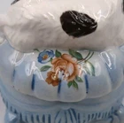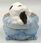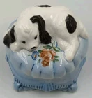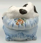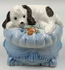 Vintage Ceramic Staffordshire Cocker Spaniel On Blue Ottoman Trinket Box USED 3-3/8" x 3". There is manufacturers defects and some age wear. Please look carefully at the pictures for any imperfections. Extra care and attention is used in shipping, making sure that your item finds it's new home safely. Shipped with USPS.