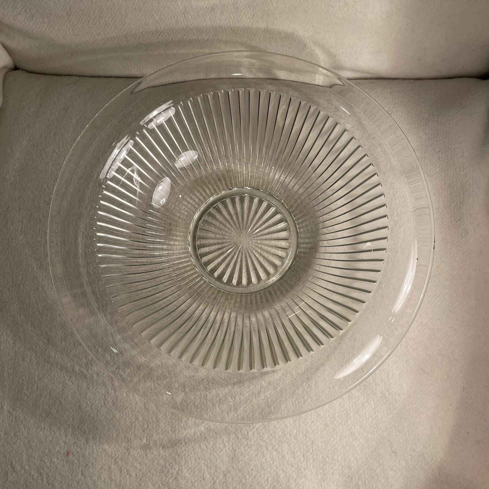 This vintage clear glass serving bowl features a round shape with ribbed detailing and a wide rim, measuring 11.25 inches in diameter and 2.5 inches in height. Made of pressed glass using a fused glass production technique in the 1960s, this mid-century modern piece is unmarked but likely of original production. With a decorative and dishwasher-safe design, this 2.8 lb serving bowl is perfect for all occasions, adding a touch of retro charm to any table setting. Excellent condition. No chips or cracks.