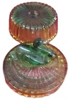 This vintage cut panel green glass swan lid covered powder dish trinket box is a small, round collectible from the 1960s. Made of glass, the trinket box features a unique swan design on its lid and comes boxed for safekeeping. Perfect for storing small trinkets or jewelry, this decorative piece adds a touch of elegance with its retro style and vibrant green color. Look at pics, has a few chips on rim teeth as shown
