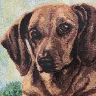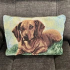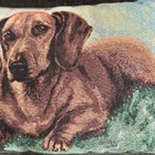 Cute tapestry Dachshund dog decorative throw pillow by Linda Picken. In very good pre-owned condition with no holes or pulled threads. On close inspection there are some faint spots on the back that I tried to highlight in the photo. Measures approximately 16" x 12". You will receive the item in the photos. If there are any questions or concerns, please contact me.