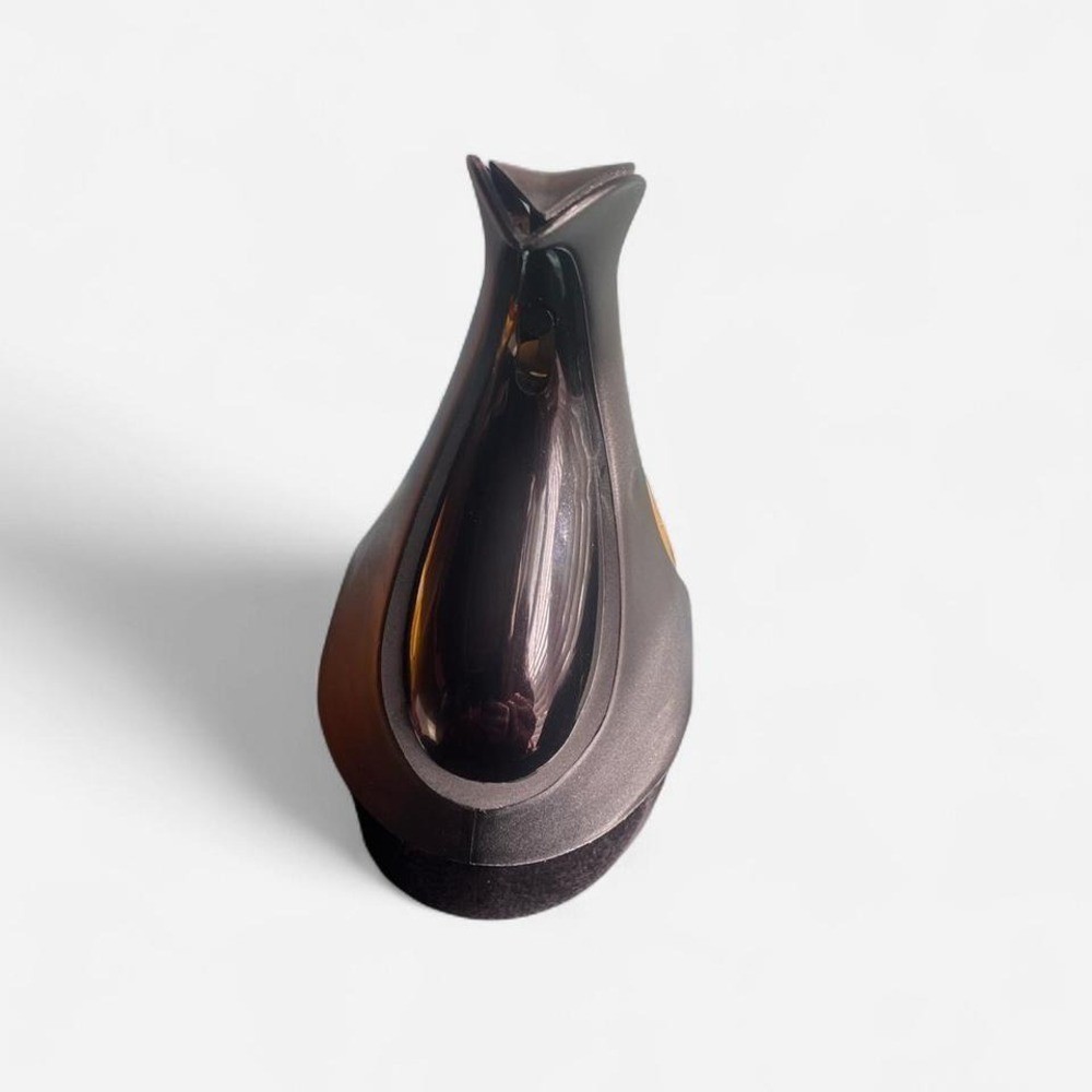 vintage Donna Karan Eau De Parfum in the black and gold swan-shaped bottle. This specific bottle design was released in 1992 and is a women's fragrance. It is a rare and discontinued item, making it a collectible for fragrance enthusiasts. The scent is described as a complex, leathery and spicy fragrance. Key fragrance notes include orange blossom, lily, rose, suede, and incense. black and gold, swan bottle, vintage perfume, collectible fragrance, 90s scent, leather notes, floral, spicy aroma, discontinued, luxury essence