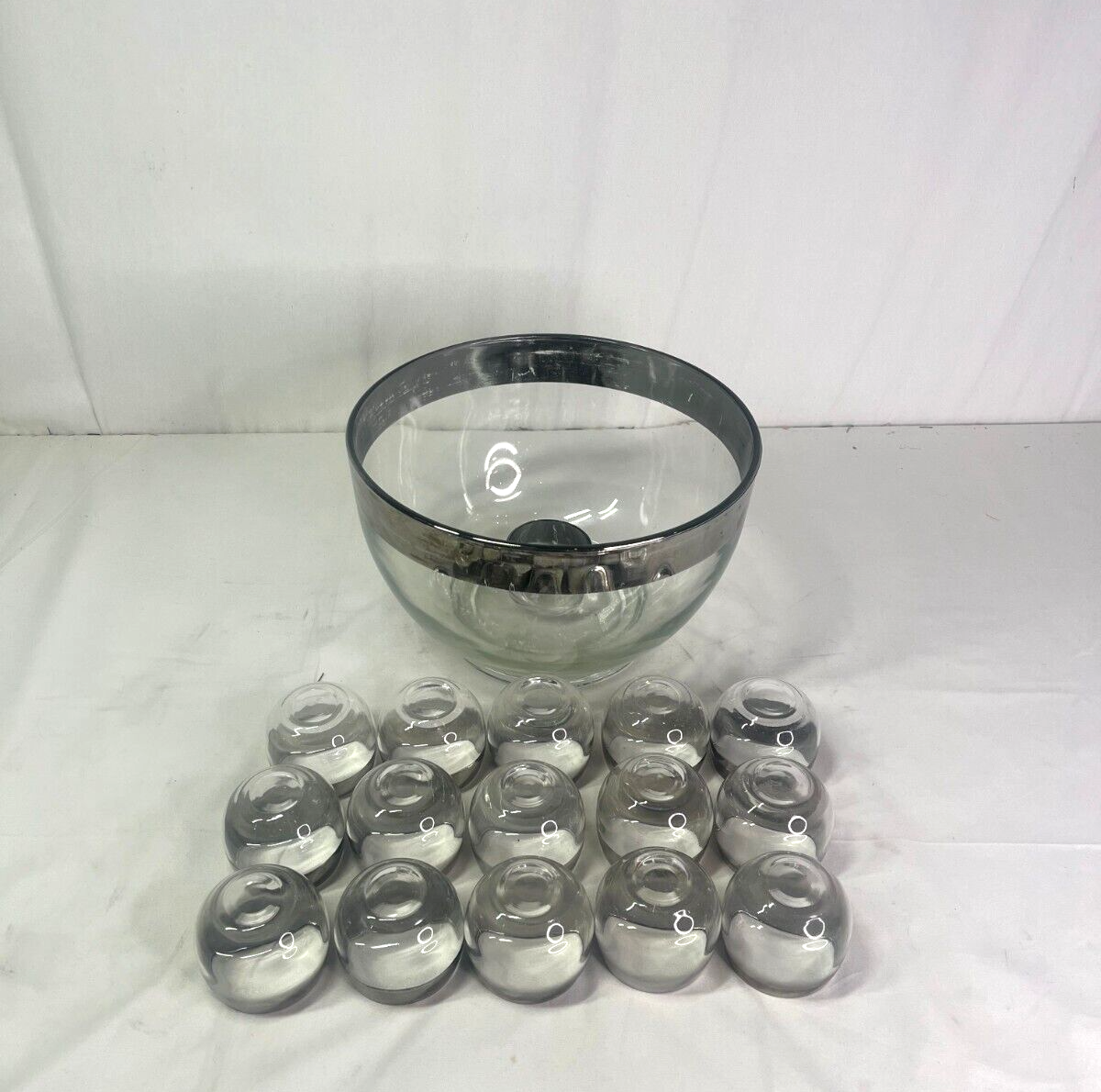 Vintage Dorothy Thorpe Silver Rimmed Punch Set - 1 Large Bowl and 16 Cups Used Good condition See photos for more.. All proceeds go to charity Hand Up Store