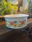 Add a splash of vintage charm to your kitchen with this beautiful enamelware Dutch oven pot featuring a vibrant floral design. This pre-owned piece showcases a classic white enamel finish with a colorful band of hand-painted flowers in red, yellow, blue, and green, giving it a retro and whimsical appeal. Crafted with sturdy construction, it includes two black handles for easy handling and a sleek silver rim, making it both functional and decorative. • Condition: Pre-owned, in good condition with minor wear consistent with age (please see photos for details). Some light scratches or surface marks on the interior and exterior, typical of vintage enamelware, but no significant chips or cracks. • Material: Enamel-coated steel. • Dimensions: Approximately 10 inches in diameter and 5 inches deep (measurements may vary slightly); capacity estimated at around 4-5 quarts. • Features: Two black handles for secure grip; no lid included. • Style: Vintage, mid-century, ideal for retro kitchens, camping, or as a decorative piece. This enamelware Dutch oven is perfect for cooking soups, stews, or casseroles, and its colorful design makes it a standout addition to your cookware collection or a charming display item. Ideal for collectors of vintage kitchenware or those seeking a nostalgic touch for their home.