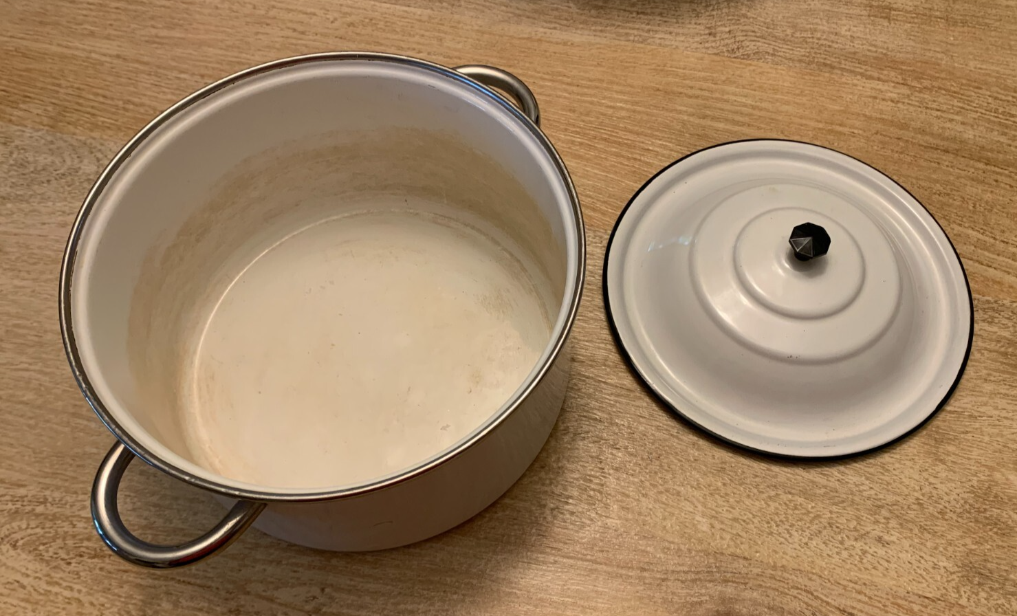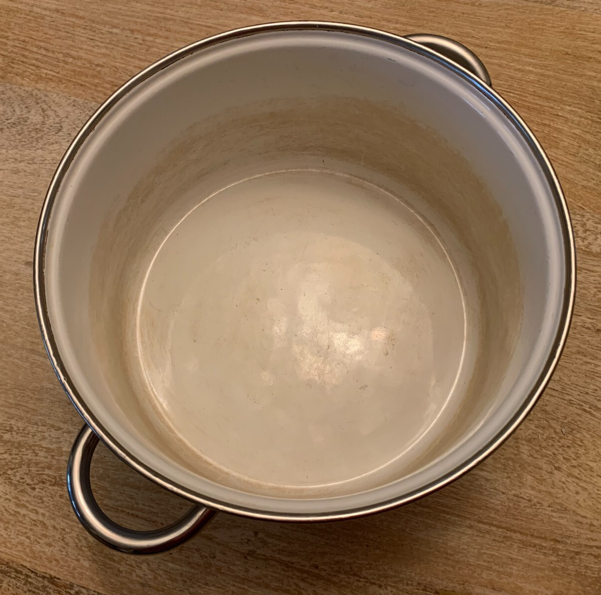 "For all stovetops, ovens, broilers, and barbeques" Vintage heavy-duty white enamelware large kettle with lid, made in West Germany by Fissler ASTA. Very good condition; there is age staining in the interior as shown. Tough sturdy steel handles, black knob and striping on lid. Pot measures 10" diameter x 6" high. Handles add another 4" width. Lid adds another 3 1/2" height. Weighs 6 pounds! Fast shipping, quality packed, smoke-free household, trackable. Thanks for looking :)