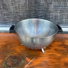 Vintage: Farberware Stainless Steel Colander Strainer Black Handles Footed 8"W x 5”D Heart shaped holes in the sides. Made in USA Closet shelf #2 for inventory
