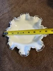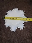 The Vintage Fenton Silver Crest White Milk Glass Ruffled Edge Bowl Candy Dish is a round, 8" glass bowl with a glossy finish and silver crest pattern. This handmade, mid-century modern piece was produced in the United States and features a decorative design. The bowl, part of the Laced Edge product line by Fenton, adds a touch of elegance to any occasion. Glows green in uv, both the white and clear. Excellent condition.