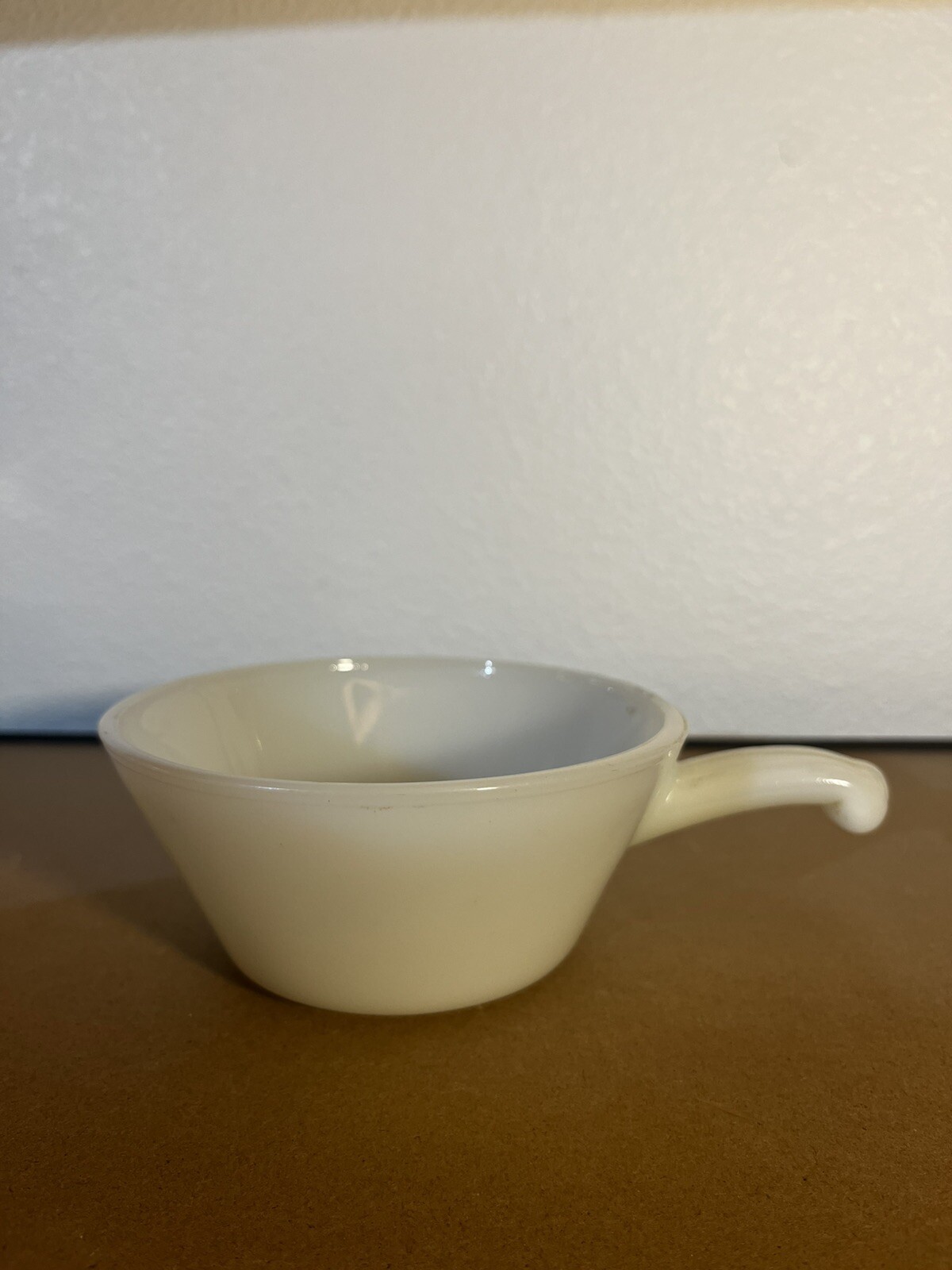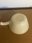 This vintage Fire King Anchor Hocking Milk Glass Chili Soup Bowl with handle is a Mid-Century Modern piece made in the USA. The white bowl is made of milk glass and is part of the Fire-King product line. It is a soup bowl with a vintage original design, ideal for serving chili or soup.