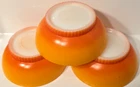 This is a set of 3 vintage Fire King bowls by Anchor Hocking, made in USA. They are a small cereal bowl size, just under 5 inches wide and 2 inches tall. The upper area is a pumpkin orange color, transitioning into a dark orange at the bottom. The coating is in nice condition, no haziness and vivid. A few tiny contact/transfer spots are present but not highly noticeable when in use. One bowl has a pale gold color spot near the inside of the rim (2nd to last photo). I can't tell if it is a stain or inside the surface of the glass. Overall they look great. Thanks for looking! Please ask any questions BEFORE purchasing/offer, and see my other listings for more!