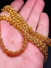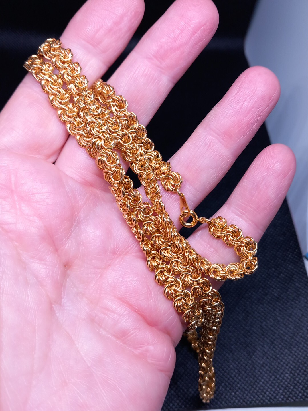 Item: Fab necklace. Flatlay complex design chain in a bright gold colour. 24" 81cm 0.8cm wide. Springring clasp. Condition: Good unused condition, some signs of wear from being in storage: see photos. DISPLAY BOX/STAND NOT INCLUDED.