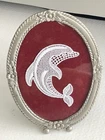 Vintage Framed Crochet Doily Dolphin Handmade Precious Home Decor Embroidery. 15 x 10 cm. Can also be used as a photo frame if preferred. Preowned, a small chip set top of glass - photo 4 - otherwise in good condition. Please see photos for more details. Add a touch of vintage charm to your home decor with this precious handmade crochet doily featuring a lovely dolphin pattern. The oval-shaped doily measures 15cm in length and 10cm in width, framed in a silver colour metal that complements its multicoloured lace and linen material. This unique home decor item is perfect for collectors of animal and dinosaur-themed pieces, and is sure to be a conversation starter in any room. The doily is carefully hand-crocheted, with exquisite embroidery that showcases the intricate details of the dolphin character. This one-of-a-kind item was made in the United States, and is suitable for use in various rooms including the kitchen, living room, or bedroom. Whether you're a fan of vintage collectables or simply looking for a unique home decor piece, this framed crochet doily is a must-have for any lover of handmade treasures.