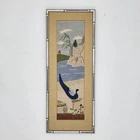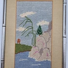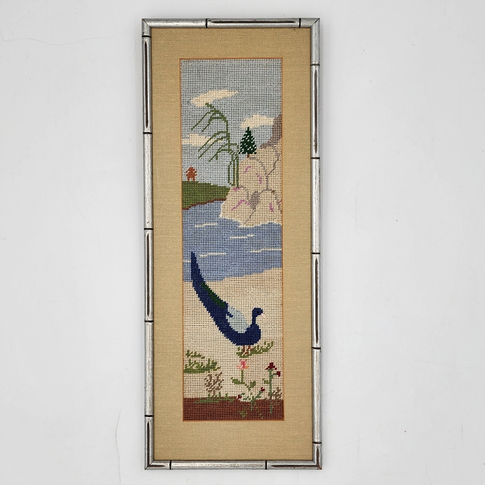 Charming vintage hand-stitched needlepoint artwork featuring a serene landscape with a graceful peacock by a riverside. The scene is beautifully detailed with soft pastel tones—blue water, tan sand, green foliage, and a small red-roofed house in the distance—creating a peaceful, nature-inspired composition. Presented in a narrow rectangular frame with a linen mat and silver-toned trim, the piece has a refined, mid-century aesthetic perfect for bohemian, cottage, or traditional interiors. Medium: Needlepoint embroidery on fabric Frame Size: Approx. 8.5” x 20.5” (including frame) Era: Likely mid-20th century Condition: Very good vintage condition with minor age wear to frame consistent with age Style: Folk Art / Mid-Century Decorative Needlework A lovely handmade textile piece that brings a touch of warmth and artistry to any wall.