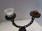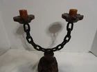 Description: 8/16/14/12/book # 507 Mid Century Modern Spanish- Mediterranean Gothic Medieval carved wood and metal set of 2 tabletop candelabras. Each has a 2-arm iron chain holding up candleholder The base is carved wood, the same as the cup’s/ candleholders. The chains are welded to stay up. They are not exactly identical as they are handcrafted in the 1960’s, not machine-made mass production. Each is approx. 13” tall x 10.5” wide and 4.5” deep Unpacked they weigh 3.75 pounds The candles are decorative only- I have a few pictures showing that you can use other candles if you want. Nice retro used condition- appropriate patina for their age, as found. Please zoom and view all pictures for more details as they are part of the description. I DO MY BEST TO DESCRIBE EVERY LISTING BUT I AM NOT AN EXPERT AND ITEMS ARE SOLD “AS IS”. My idea of great/good may be different than yours, so EXAMINE PHOTOS CAREFULLY since they are binding and a supplement to the word description in case I should miss something. If I fail to mention something, it does not qualify as “item not as described” if it shows in my pictures. EACH PHOTO IS WORTH A THOUSAND WORDS AND THEY ARE OF THE EXACT ITEM YOU WILL RECEIVE. RETURN POLICY: Returns are acceptable ONLY if the item doesn’t match the description, is defective, or grossly misrepresented. All sales are final. THIS MEANS I DO NOT ACCEPT RETURNS for FIT, SIZING, COLOR ISSUES, OR BUYER'S REMORSE. Please zoom and view ALL pictures for more details as they are part of the description. Email me with any questions you may have. Please note: Buyer pays ALL return shipping and fees. · FEEDBACK I do not leave feedback until the end of a transaction. The transaction is considered over once I receive feedback from you confirming that you have received it and expressed satisfaction with it. If you are unsatisfied with your purchase, please contact me before leaving a neutral or negative feedback- so I can fix the issues. Thanks again for shopping at our eBay store and look forward to serve you. · · Email me with any questions. · No reasonable offer refused.