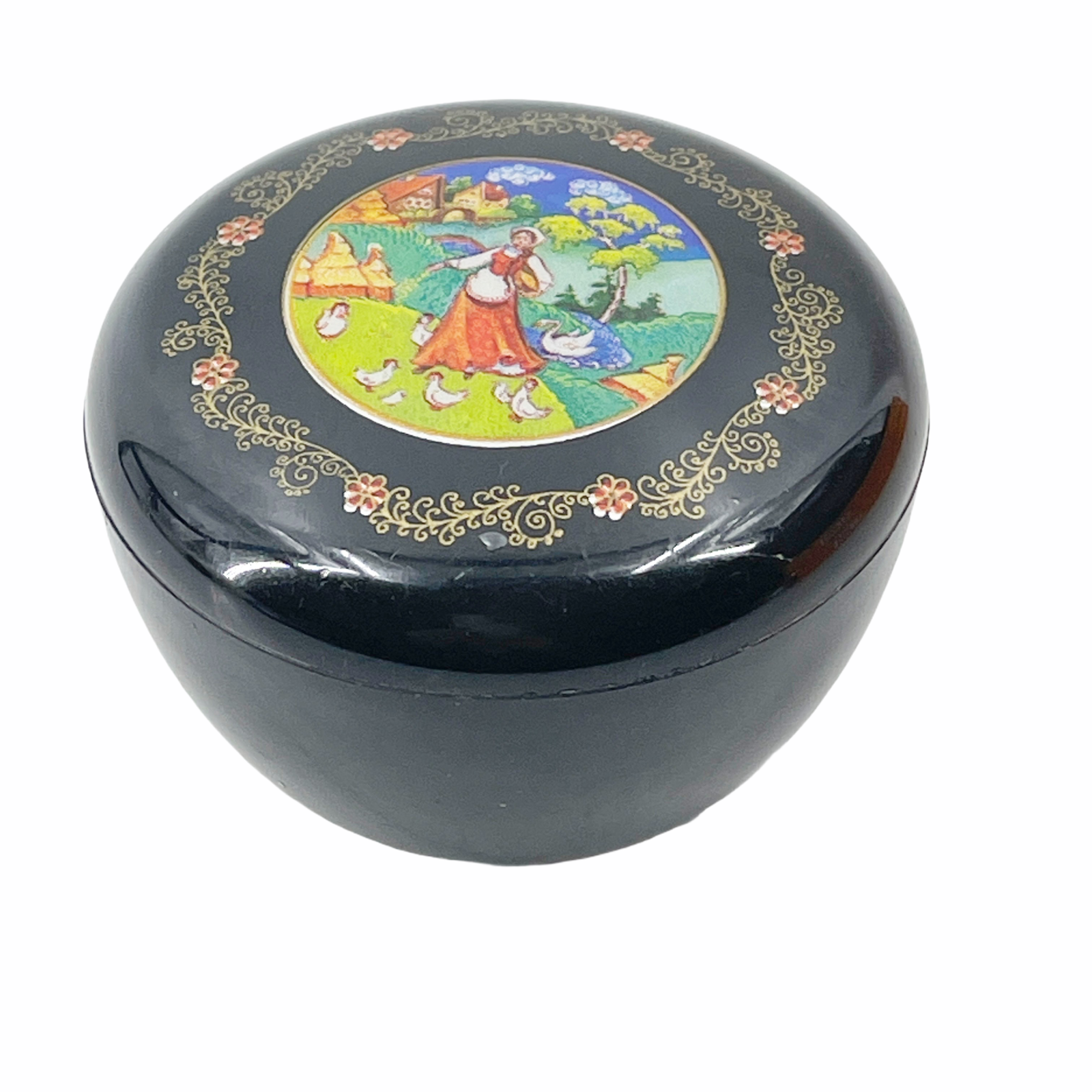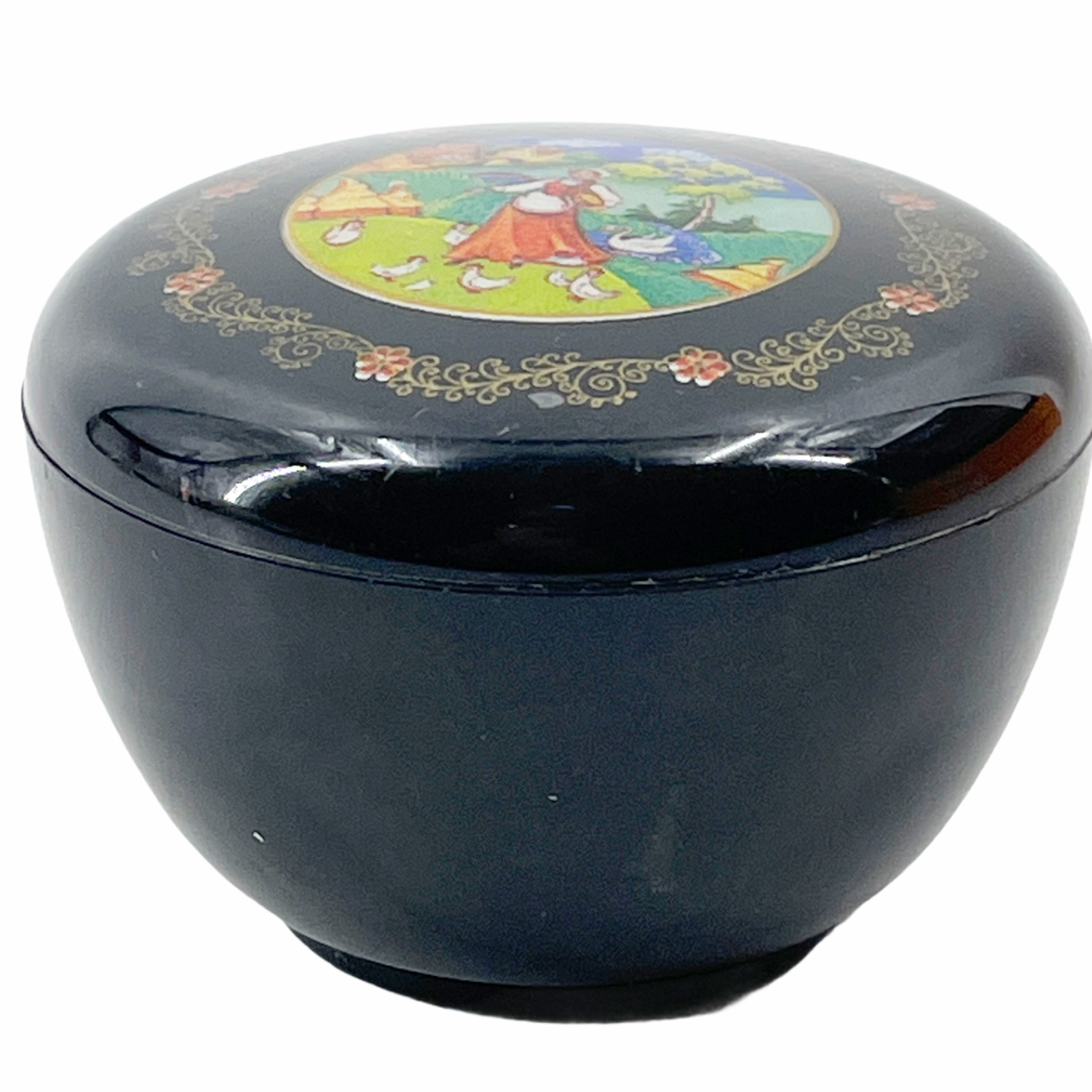 Vintage Hallmark Cards Trinket Box Round Black Plastic Lacquer Dutch Girl Birds 2 3/4" diameter and 2" tall.
